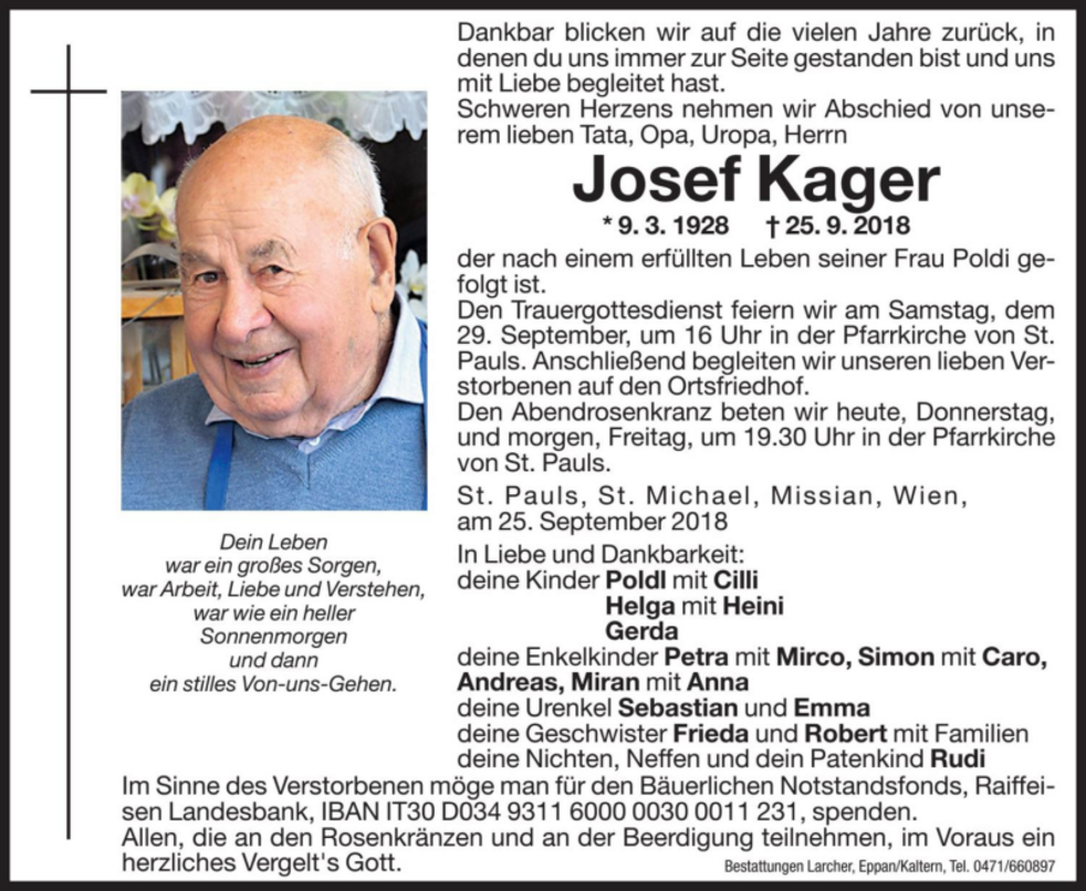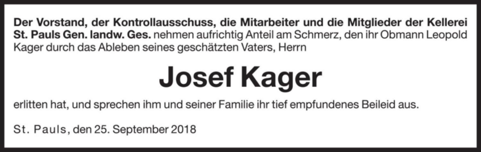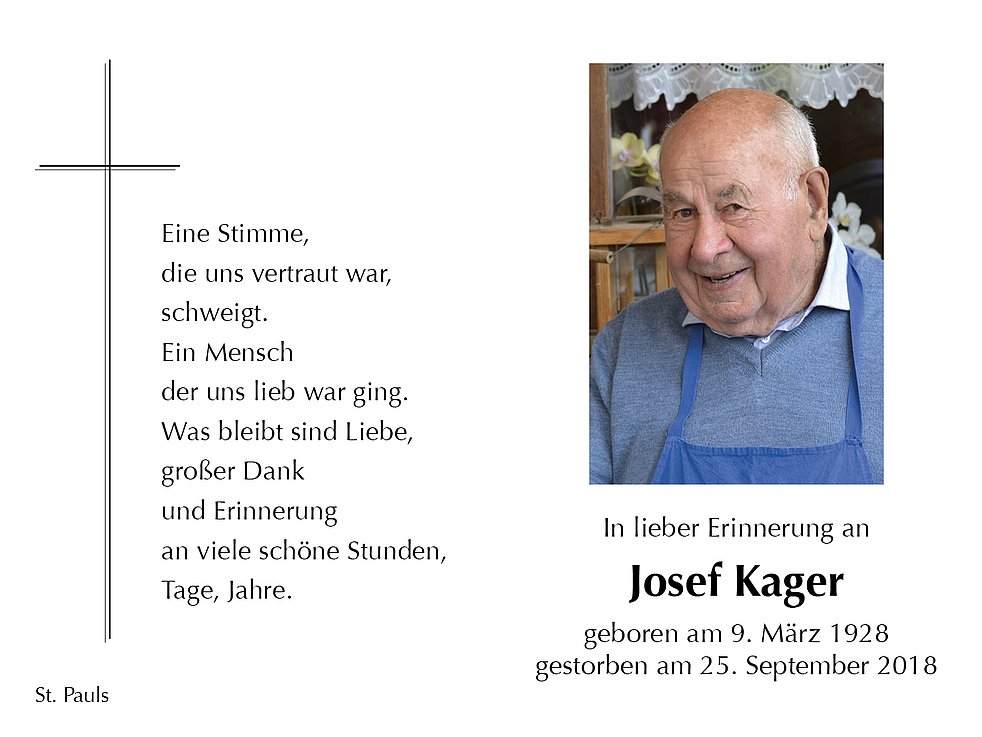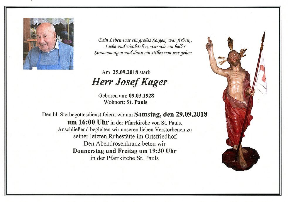 Den Trauergottesdienst feiern wir am Samstag, dem 29. September um 16 Uhr in der Pfarrkirche von St. Pauls. Anschließend begleiten wir unseren lieben Verstorbenen auf den Ortsfriedhof.