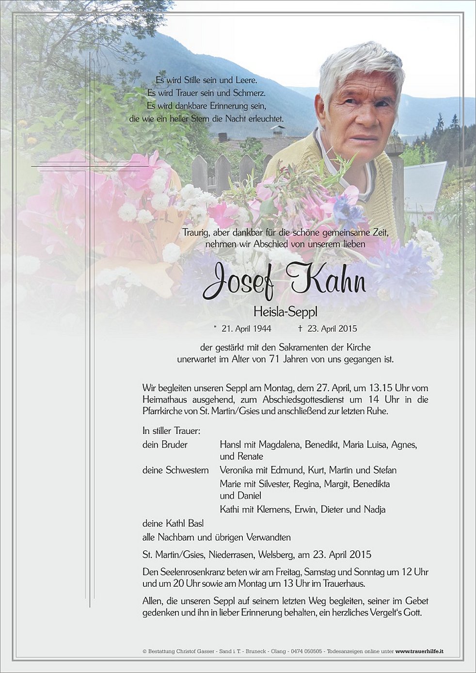 Wir begleiten unseren Seppl am Montag, dem 27. April, um 13.15 Uhr vom Heimathaus ausgehend, zum Abschiedsgottesdienst um 14 Uhr in die Pfarrkirche von St. Martin/Gsies und anschließend zur letzten Ruhe.