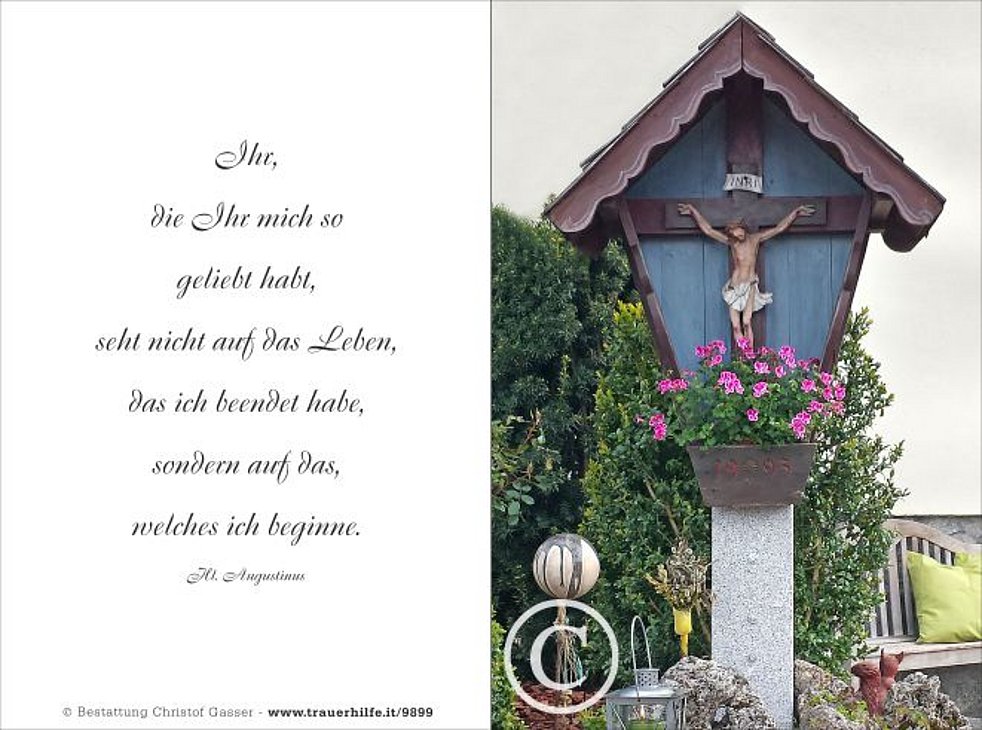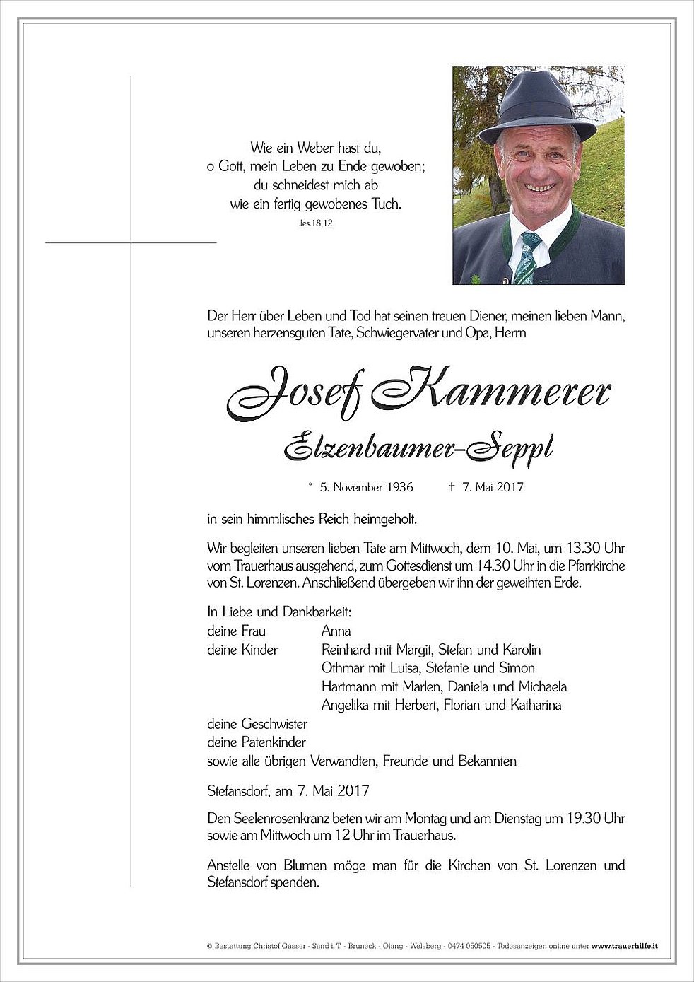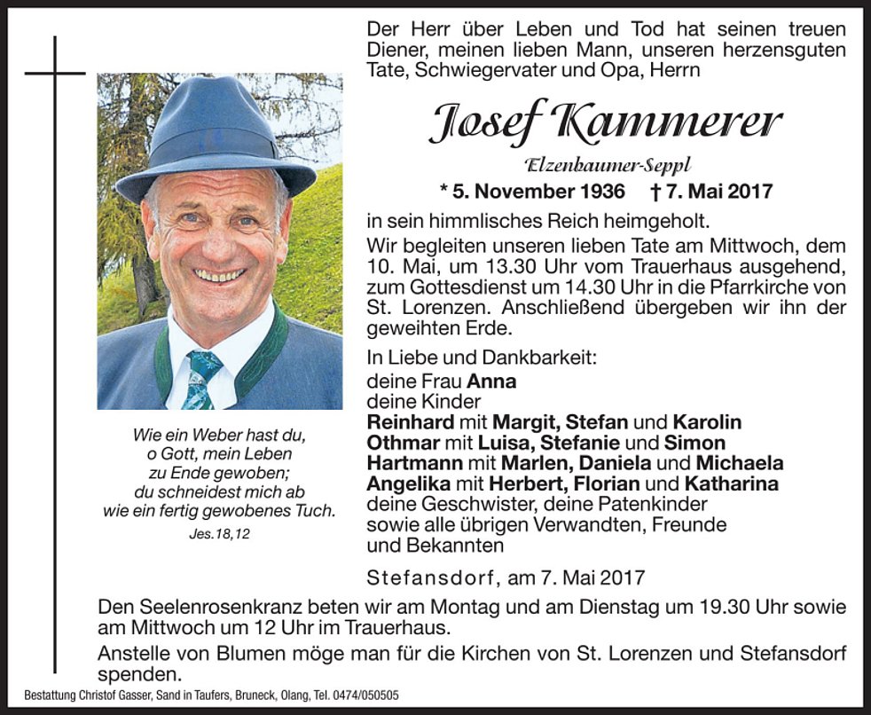 Wir begleiten unseren lieben Tate am Mittwoch, dem 10. Mai, um 13.30 Uhr vom Trauerhaus ausgehend, zum Gottesdienst um 14.30 Uhr in die Pfarrkirche von St. Lorenzen. Anschließend übergeben wir ihn der geweihten Erde.