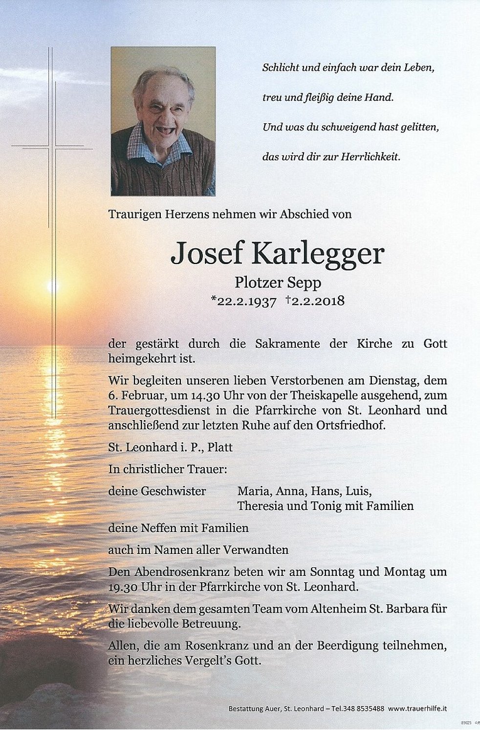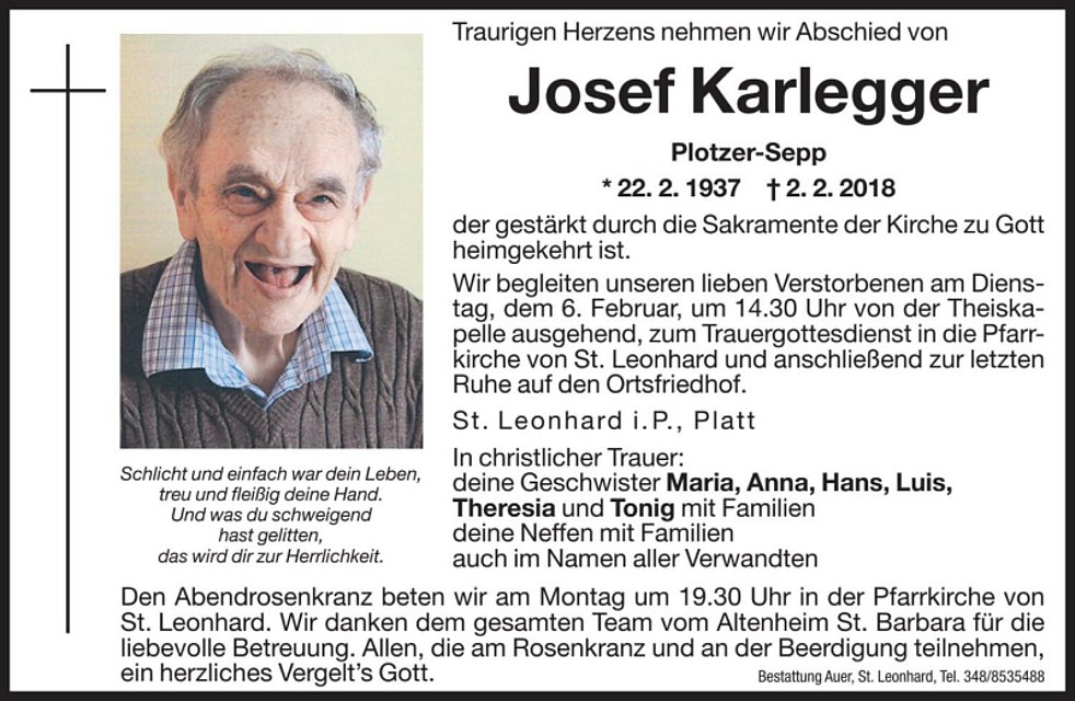 Wir begleiten unseren lieben Verstorbenen am Dienstag, dem 6. Februar, um 14.30 Uhr von der Theiskapelle ausgehend, zum Trauergottesdienst in die Pfarrkirche von St. Leonhard und anschließend zur letzten Ruhe auf den Ortsfriedhof.