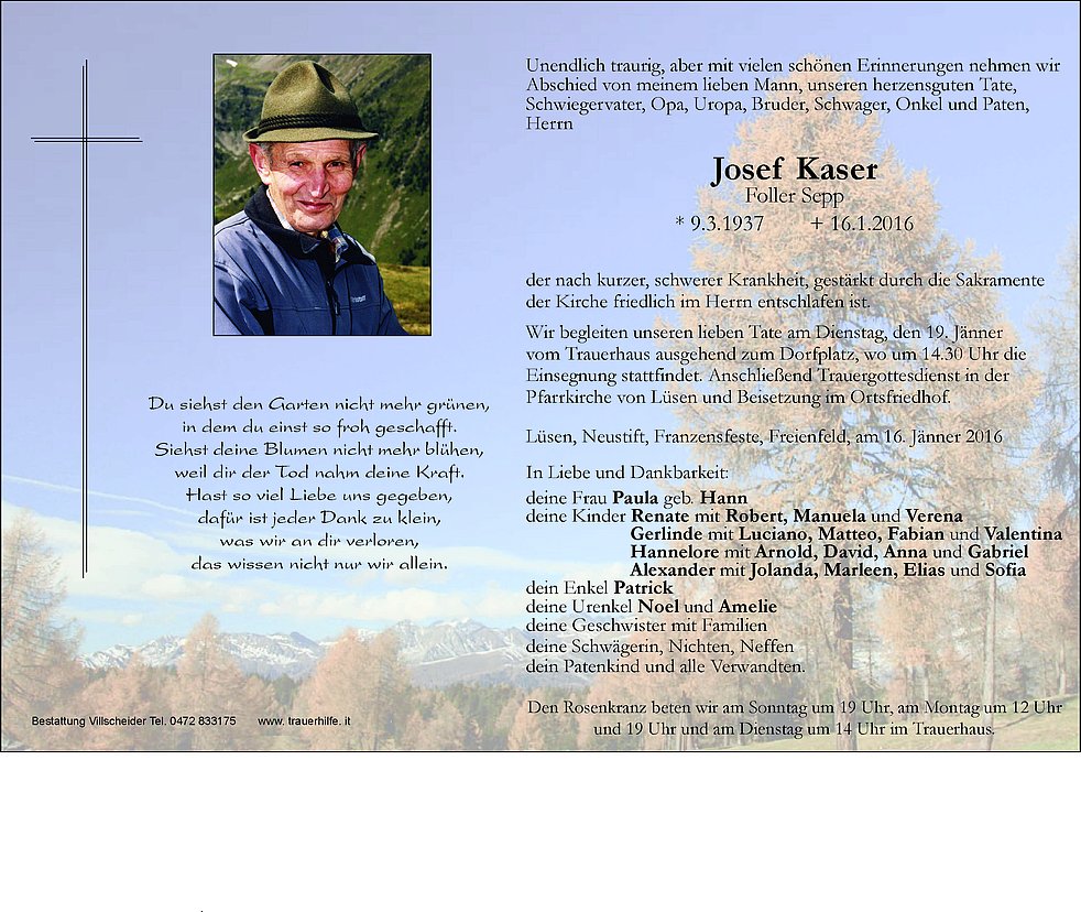 vom Trauerhaus ausgehend zum Dorfplatz, wo um 14.30 Uhr die Einsegnung stattfindet. Anschließend Trauergottesdienst in der Pfarrkirche von Lüsen und Beisetzung im Ortsfriedhof.