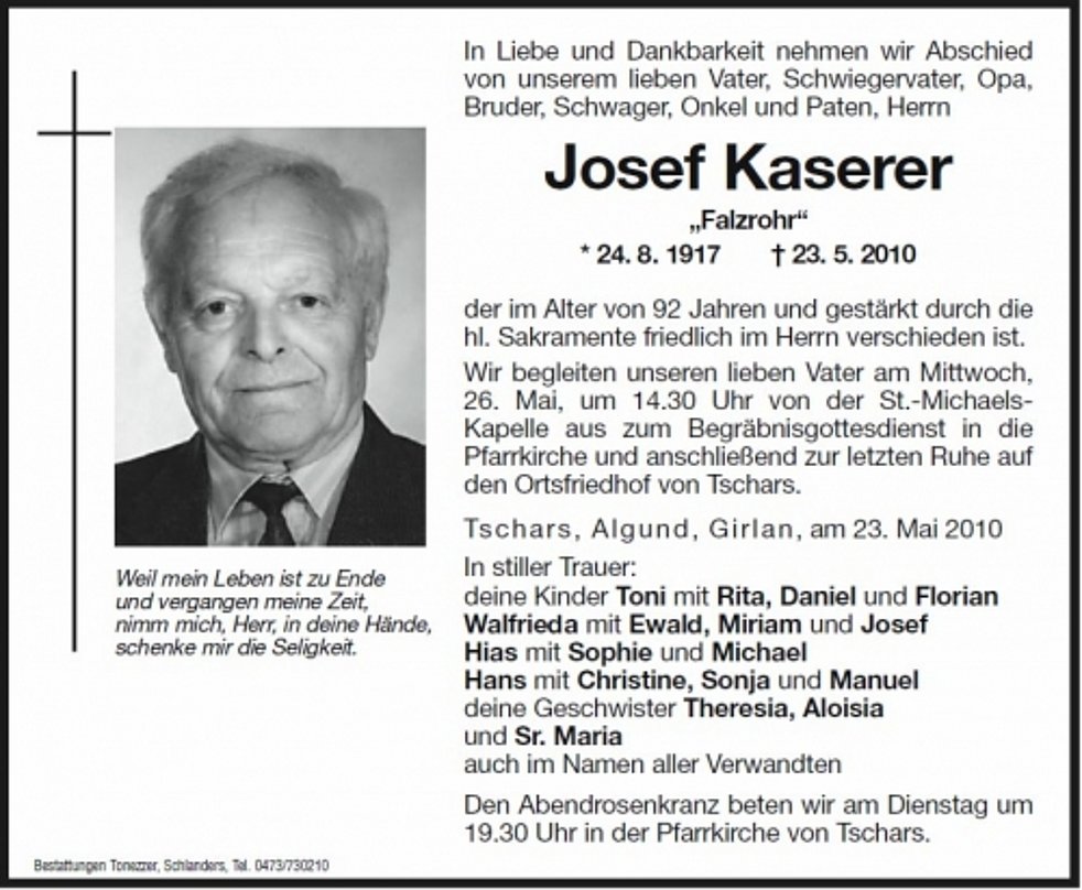 Wir begleiten unseren lieben Vater am Mittwoch, 26. Mai, um 14.30 Uhr von der St. Michaelskapelle aus zum Begräbnisgottesdienst in die Pfarrkirche und anschließend zur letzten Ruhe auf den Ortsfriedhof von Tschars.