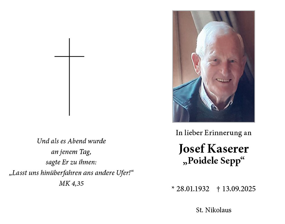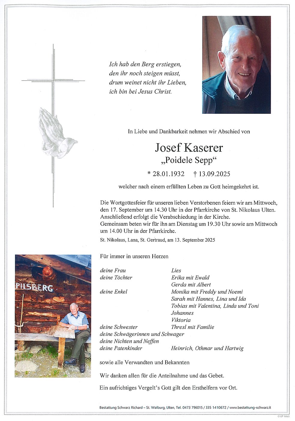 Die Wortgottesfeier für unseren lieben Verstorbenen feiern wir am Mittwoch, den 17. September um 14.30 Uhr in der Pfarrkirche von St. Nikolaus Ulten.