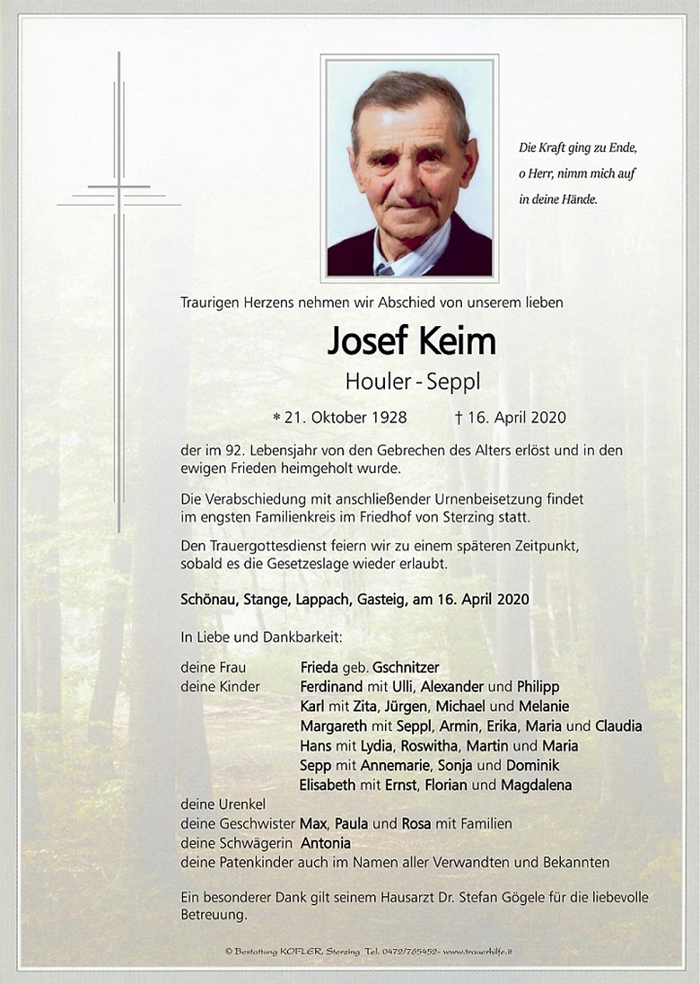 Ein besonderer Dank gilt seinem Hausarzt Dr. Stefan Gögele für die liebevolle Betreuung.