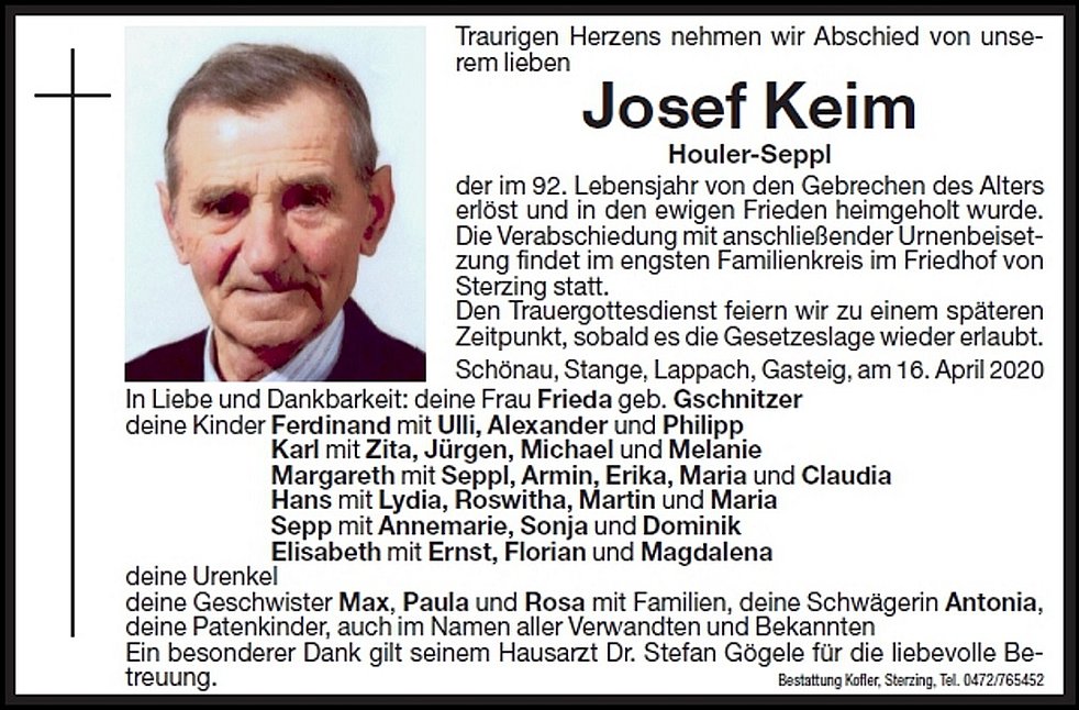 Die Verabschiedung mit anschließender Urnenbeisetzung findet im engsten Familienkreis im Friedhof von Sterzing statt.