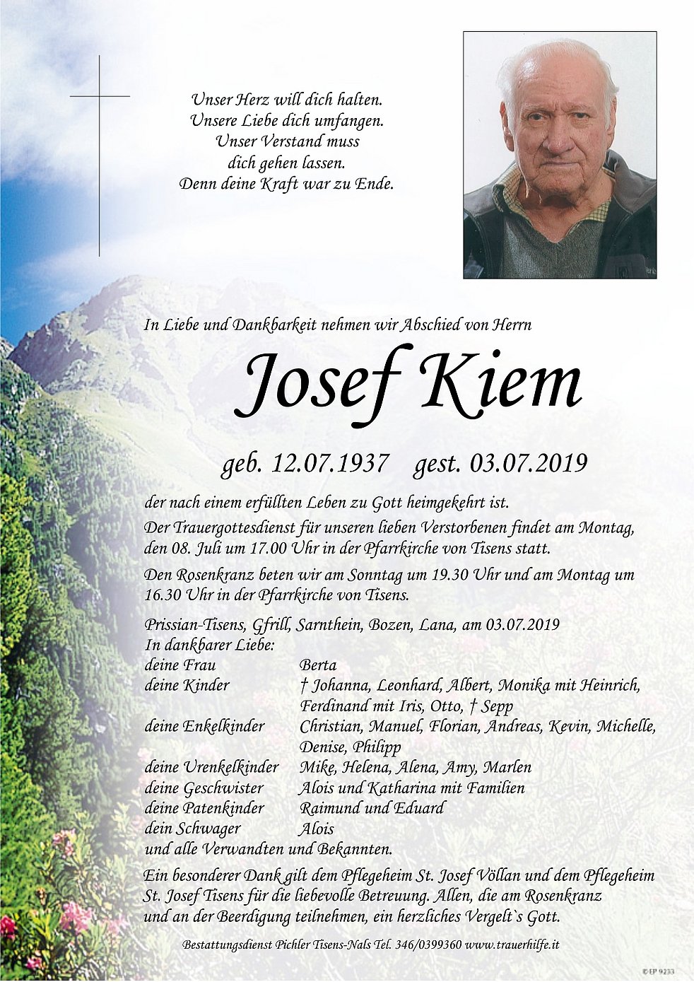 Begräbnisgottesdienst: 08.07. - 17:00 Uhr Tisens