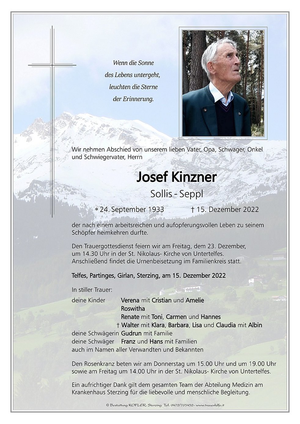 Den Trauergottesdienst feiern wir am Freitag, dem 23. Dezember, um 14.30 Uhr in der St. Nikolaus- Kirche von Untertelfes. Anschließend findet die Urnenbeisetzung im Familienkreis statt.