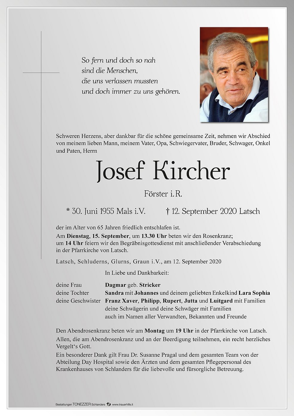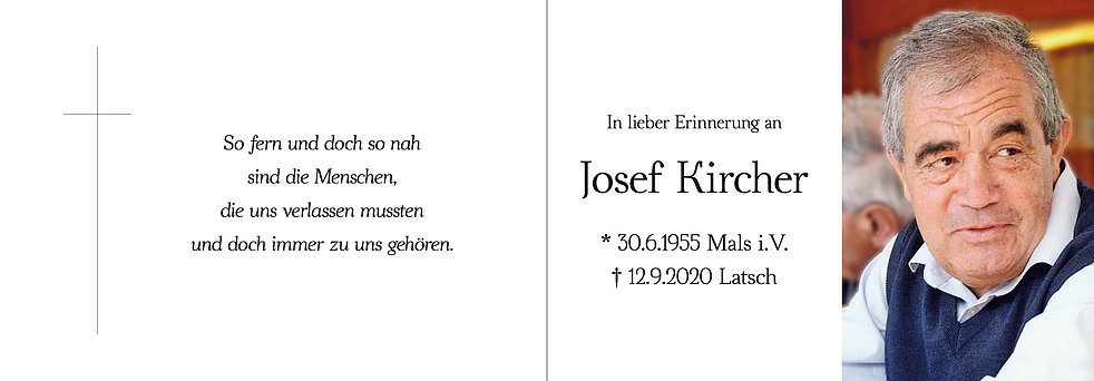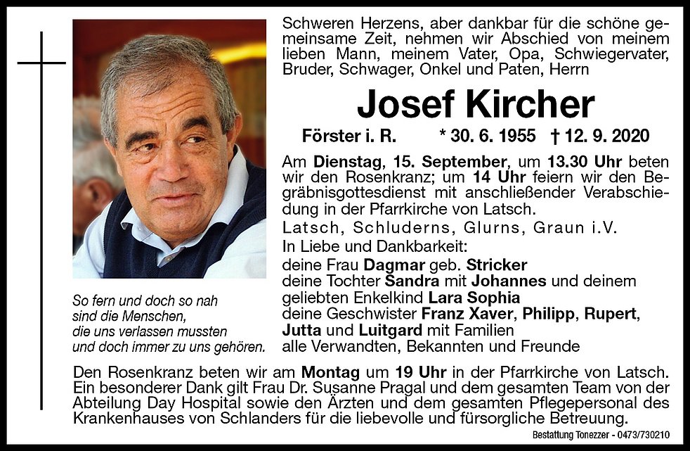 Am Dienstag, 15. September, um 13.30 Uhr beten wir den Rosenkranz; um 14 Uhr feiern wir den Begräbnisgottesdienst mit anschließender Verabschiedung in der Pfarrkirche von Latsch.