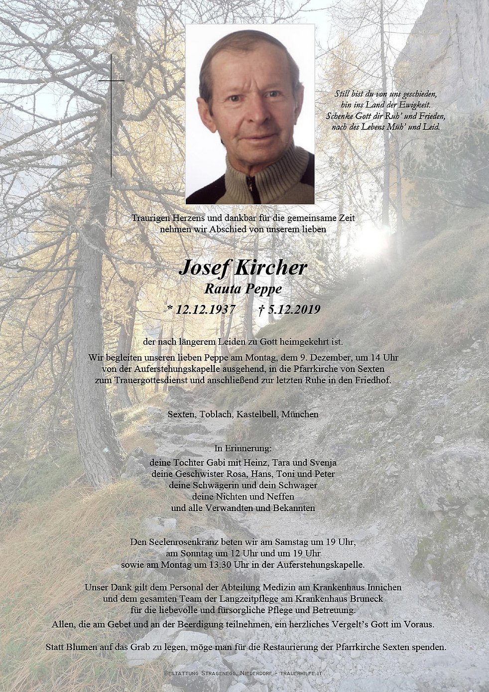 Wir begleiten unseren lieben Peppe am Montag, dem 9. Dezember, um 14 Uhr von der Auferstehungskapelle ausgehend, in die Pfarrkirche von Sexten zum Trauergottesdienst und anschließend zur letzten Ruhe in den Friedhof.