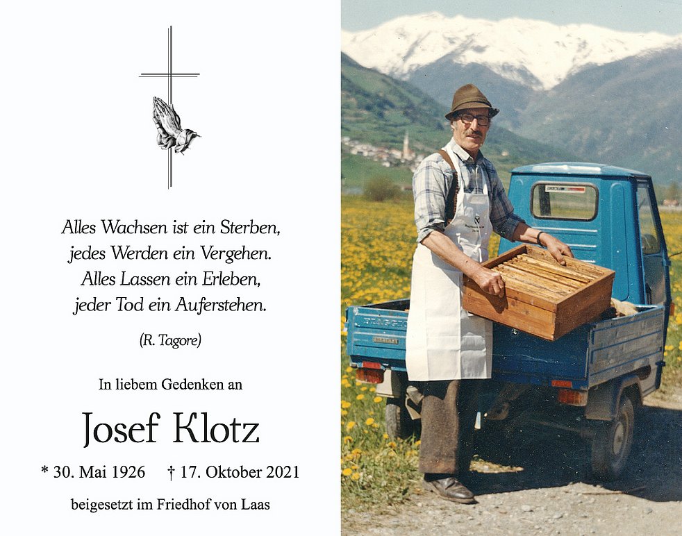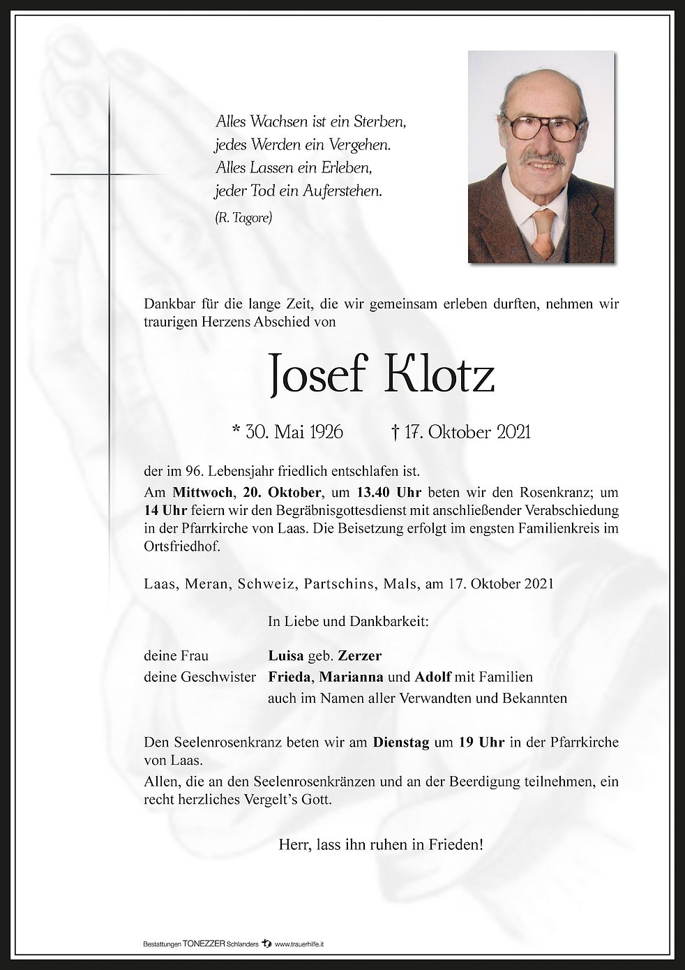 Am Mittwoch, 20. Oktober, um 13.40 Uhr beten wir den Rosenkranz; um 14 Uhr feiern wir den Begräbnisgottesdienst mit anschließender Verabschiedung in der Pfarrkirche von Laas.