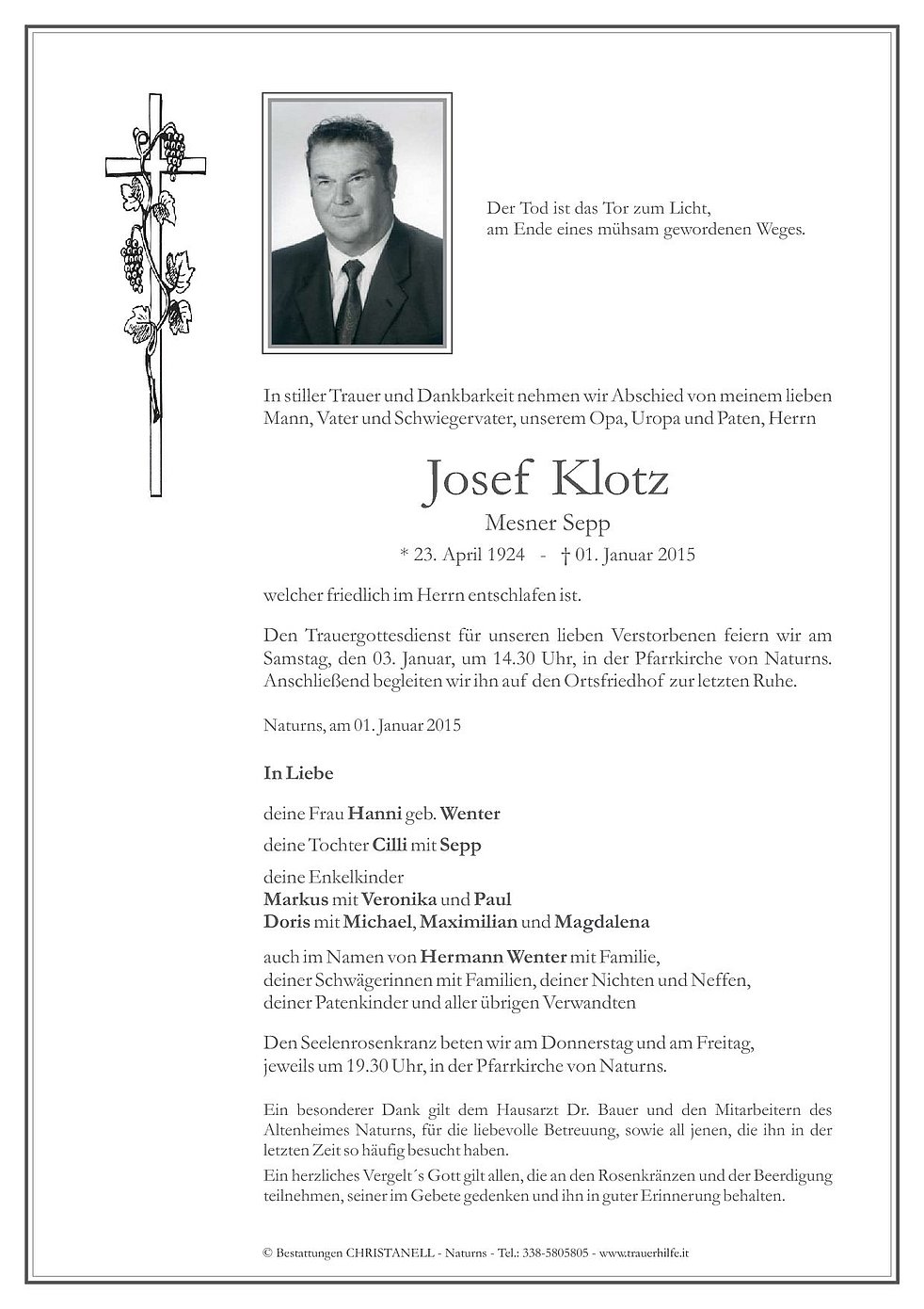 Ein besonderer Dank gilt dem Hausarzt Dr. Bauer und den Mitarbeitern des Altenheimes Naturns, für die liebevolle Betreuung, sowie all jenen, die ihn in der letzten Zeit so häufig besucht haben.