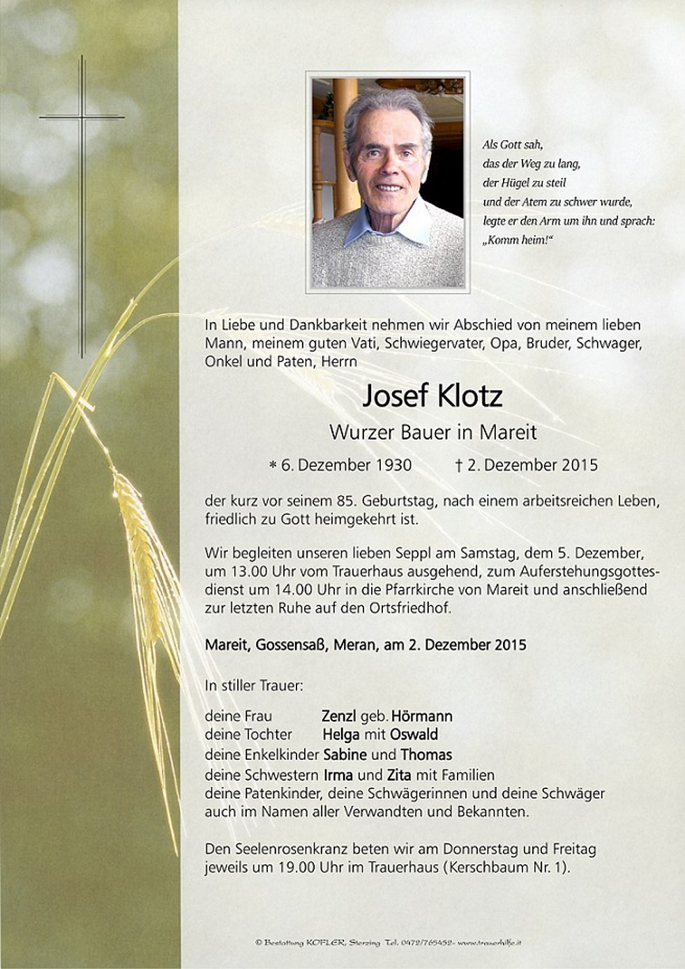 Wir begleiten unseren lieben Seppl am Samstag, dem 5. Dezember, um 13.00 Uhr