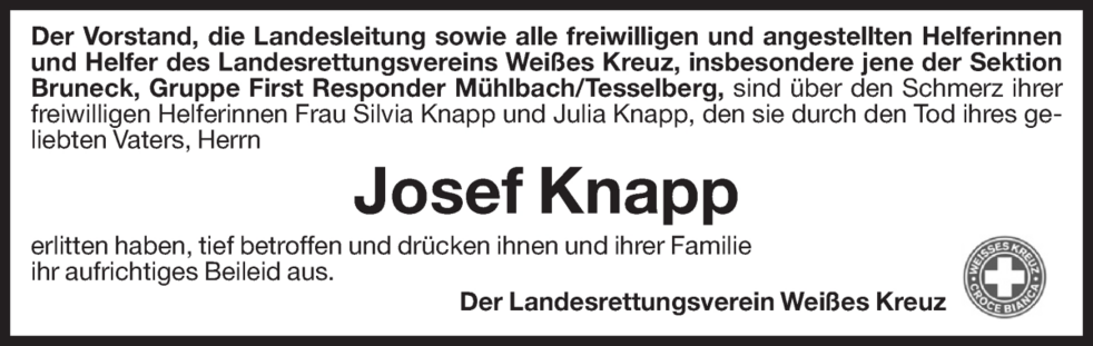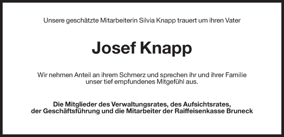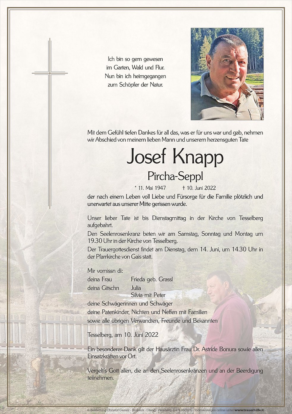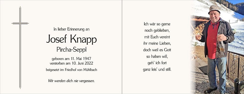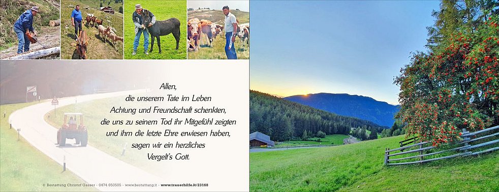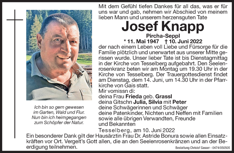 Der Trauergottesdienst findet am Dienstag, dem 14. Juni, um 14.30 Uhr in der Pfarrkirche von Gais statt.