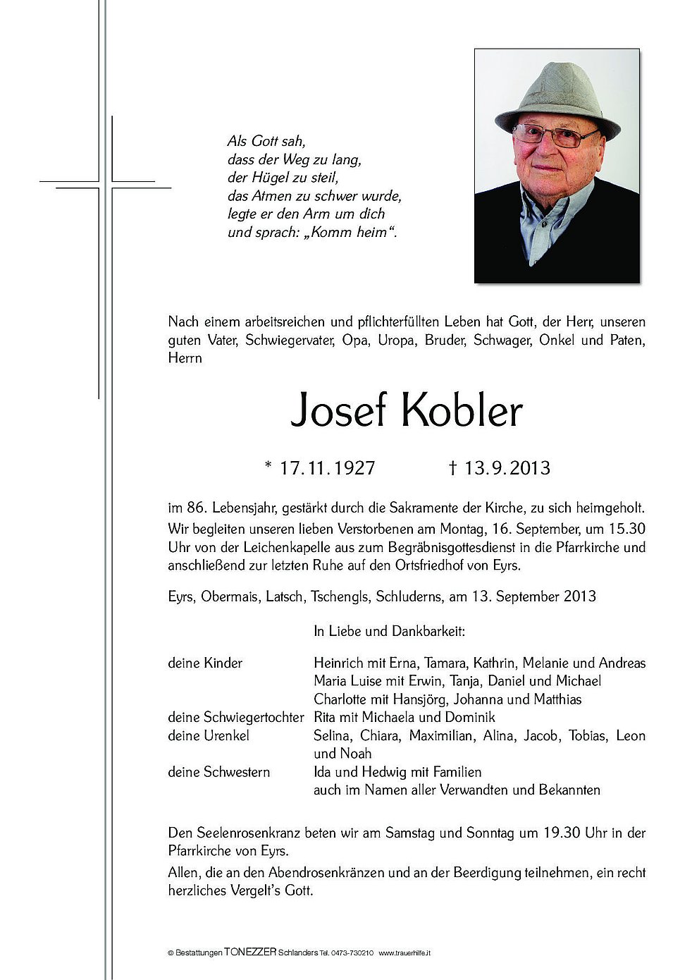 Wir begleiten unseren lieben Verstorbenen am Montag, 16. September, um 15.30 Uhr von der Leichenkapelle aus zum Begräbnisgottesdienst in die Pfarrkirche und anschließend zur letzten Ruhe auf den Ortsfriedhof von Eyrs.
