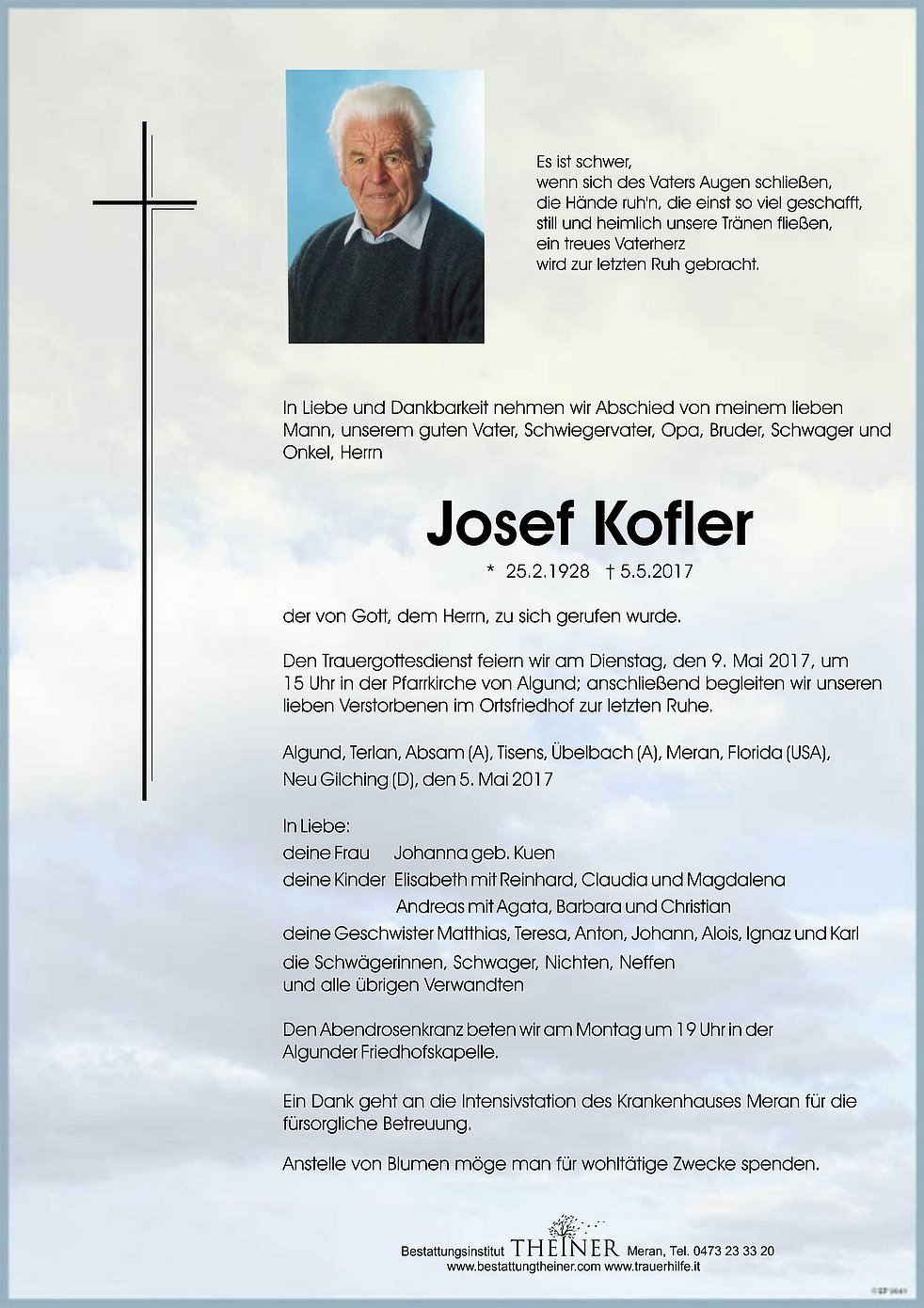 15 Uhr in der Pfarrkirche von Algund; anschließend begleiten wir unseren lieben Verstorbenen im Ortsfriedhof zur letzten Ruhe.