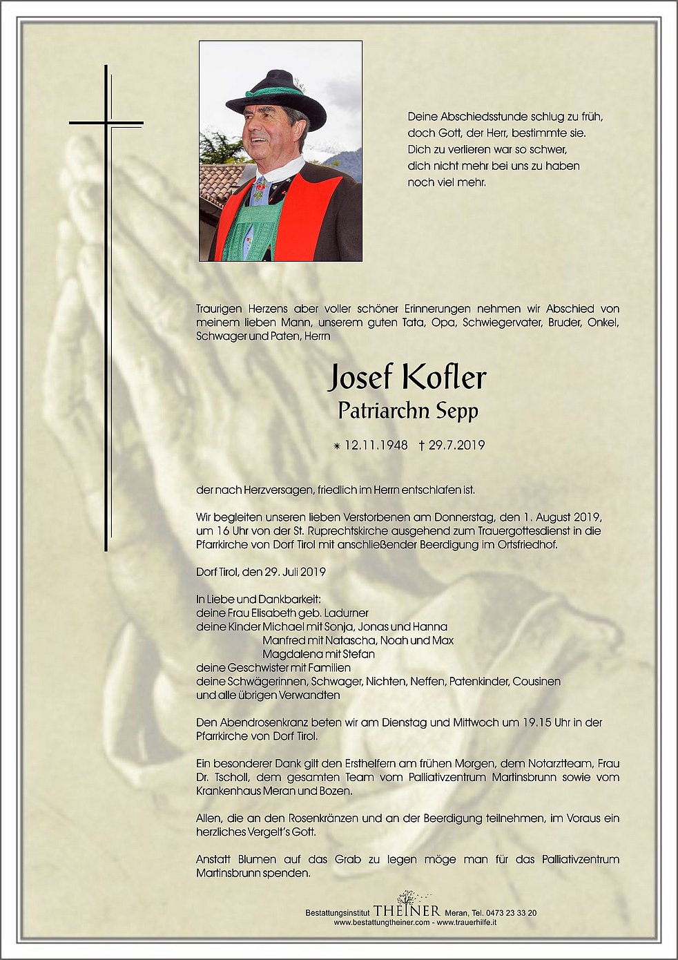 Wir begleiten unseren lieben Verstorbenen am Donnerstag, den 1. August 2019, um 16 Uhr von der St. Ruprechtskirche ausgehend zum Trauergottesdienst in die Pfarrkirche von Dorf Tirol mit anschließender Beerdigung im Ortsfriedhof.