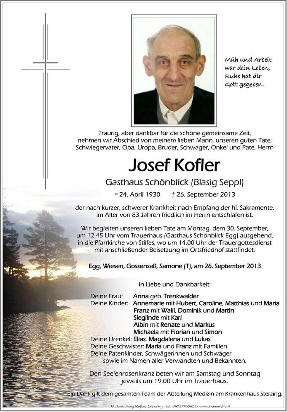 um 14.00 Uhr der Trauergottesdienst mit anschließender Beisetzung im Ortsfriedhof stattfindet.