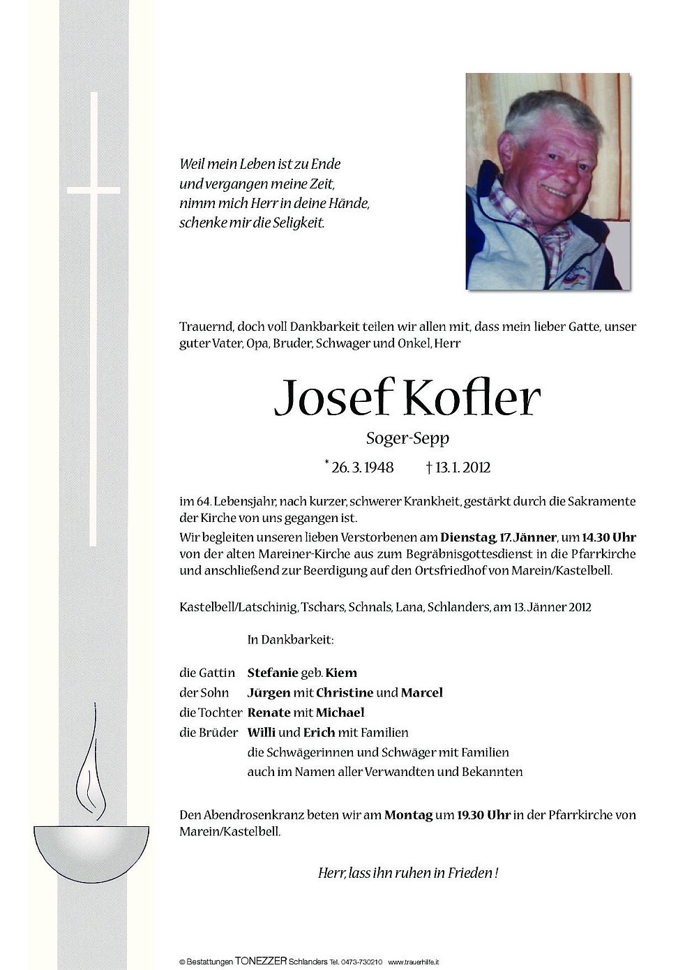 Wir begleiten unseren lieben Verstorbenen am Dienstag, 17. Jänner, um 14.30 Uhr von der alten Mareiner-Kirche aus zum Begräbnisgottesdienst in die Pfarrkirche und anschließend zur Beerdigung auf den Ortsfriedhof von Marein/Kastelbell.
