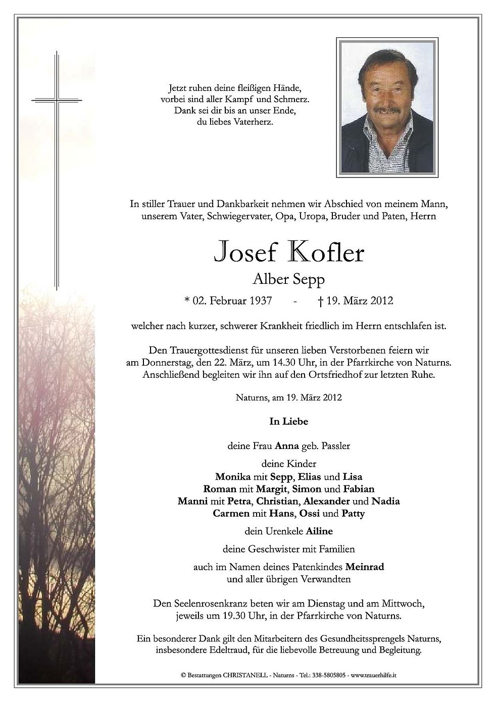 Den Trauergottesdienst für unseren lieben Verstorbenen feiern wir am Donnerstag, den 22. März, um 14.30 Uhr, in der Pfarrkirche von Naturns. Anschließend begleiten wir ihn auf den Ortsfriedhof zur letzten Ruhe.