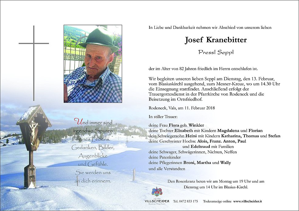 Wir begleiten unseren lieben Seppl am Dienstag, den 13. Februar, vom Blasiuskirchl ausgehend, zum Mesner-Kreuz, wo um 14.30 Uhr die Einsegnung stattfindet. Anschließend erfolgt der Trauergottesdienst in der Pfarrkirche von Rodeneck und die Beisetzung im Ortsfriedhof.