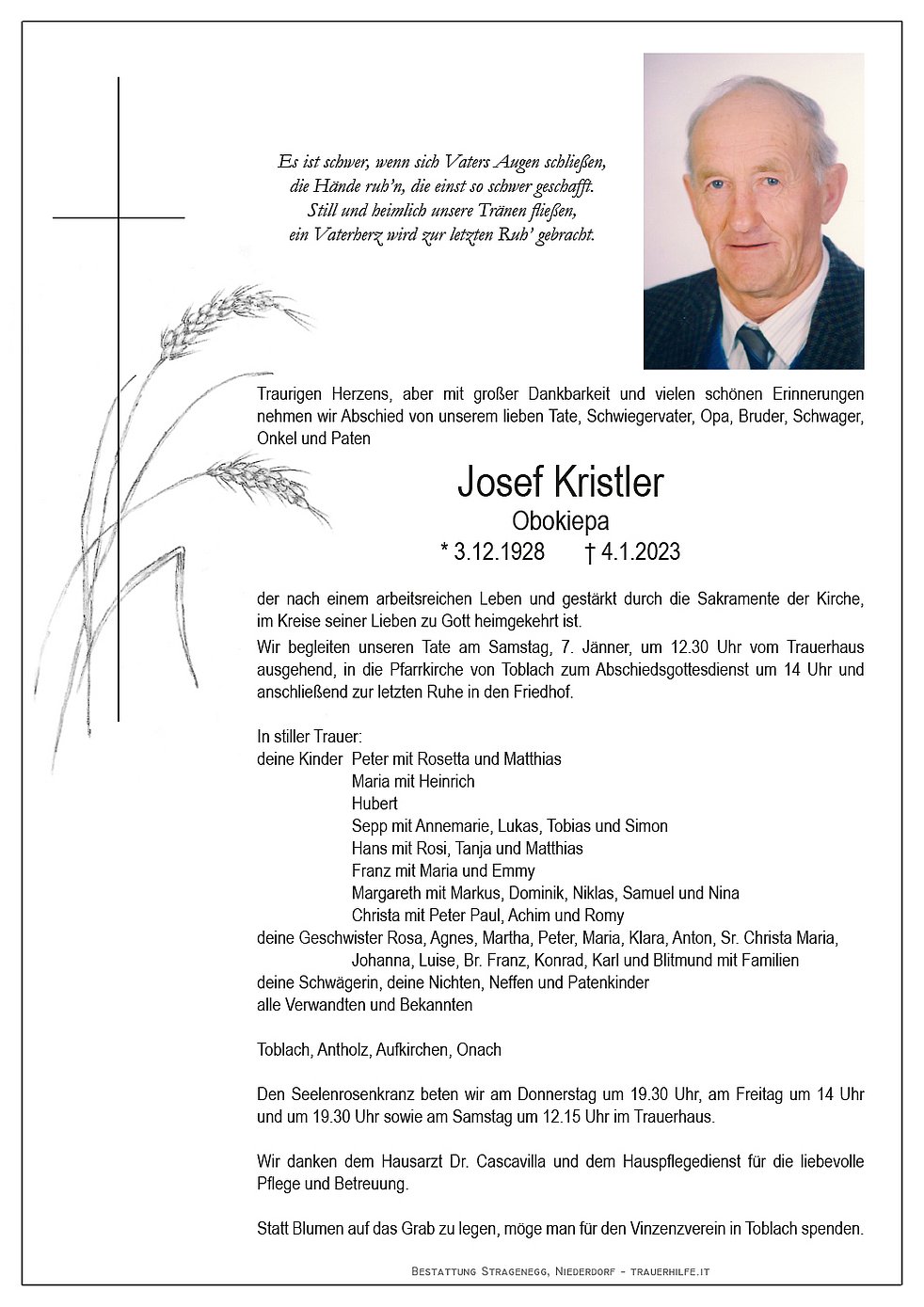 Wir begleiten unseren Tate am Samstag, 7. Jänner, um 12.30 Uhr vom Trauerhaus ausgehend, in die Pfarrkirche von Toblach zum Abschiedsgottesdienst um 14 Uhr und anschließend zur letzten Ruhe in den Friedhof.