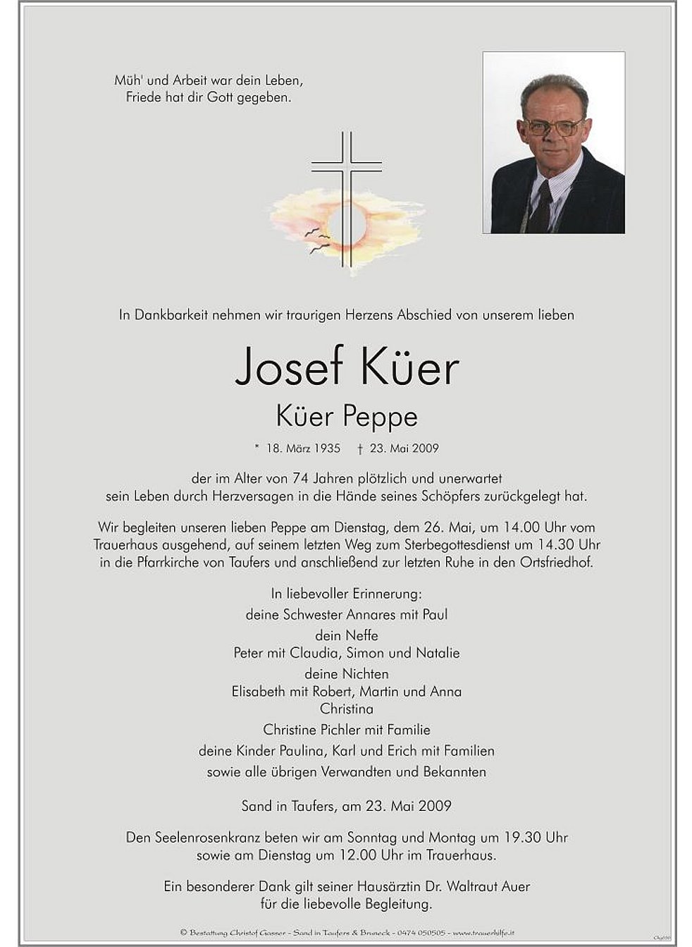 Wir begleiten unseren lieben Peppe am Dienstag, dem 26. Mai, um 14.00 Uhr vom Trauerhaus ausgehend, auf seinem letzten Weg zum Sterbegottesdienst um 14.30 Uhr in die Pfarrkirche von Taufers und anschließend zur letzten Ruhe in den Ortsfriedhof.