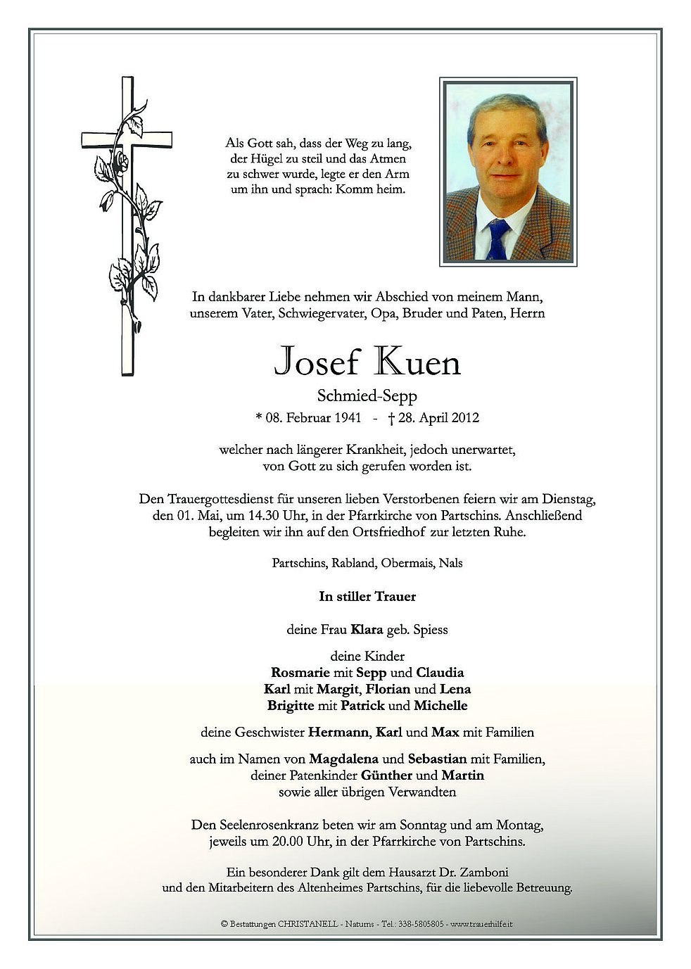 Den Trauergottesdienst für unseren lieben Verstorbenen feiern wir am Dienstag, den 01. Mai, um 14.30 Uhr, in der Pfarrkirche von Partschins. Anschließend begleiten wir ihn auf den Ortsfriedhof zur letzten Ruhe.