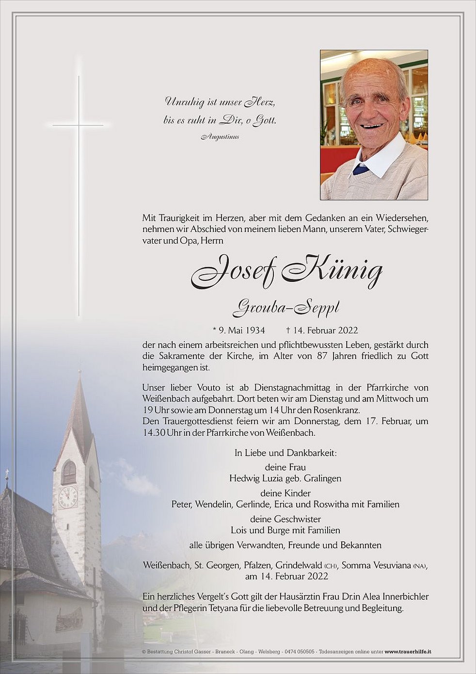 der nach einem arbeitsreichen und pflichtbewussten Leben, gestärkt durch die Sakramente der Kirche, im Alter von 87 Jahren friedlich zu Gott heimgegangen ist.