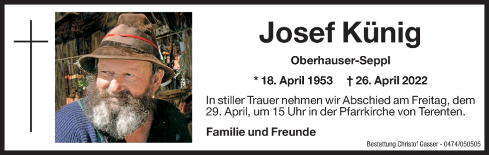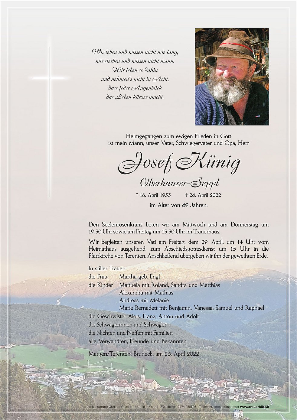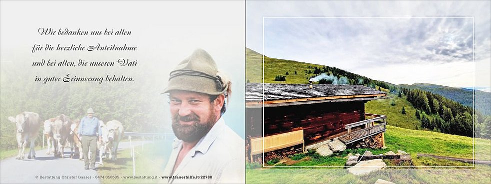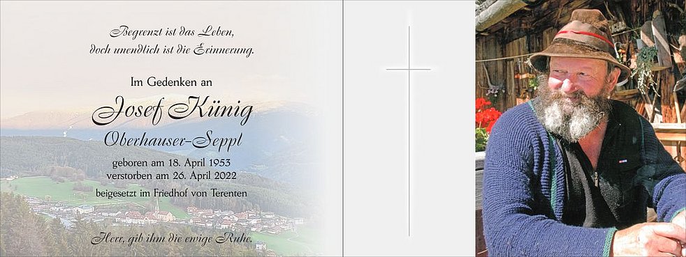Wir begleiten unseren Vati am Freitag, dem 29. April, um 14 Uhr vom Heimathaus ausgehend, zum Abschiedsgottesdienst um 15 Uhr in die Pfarrkirche von Terenten. Anschließend übergeben wir ihn der geweihten Erde.