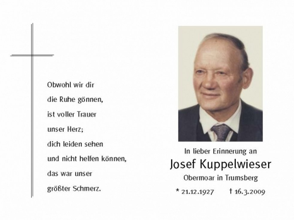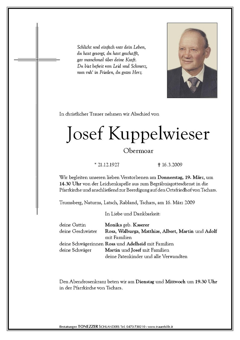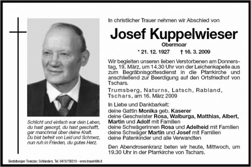Wir begleiten unseren lieben Verstorbenen am Donnerstag, 19. März, um 14.30 Uhr von der Leichenkapelle aus zum Begräbnisgottesdienst in die Pfarrkirche und anschließend zur Beerdigung auf den Ortsfriedhof von Tschars.