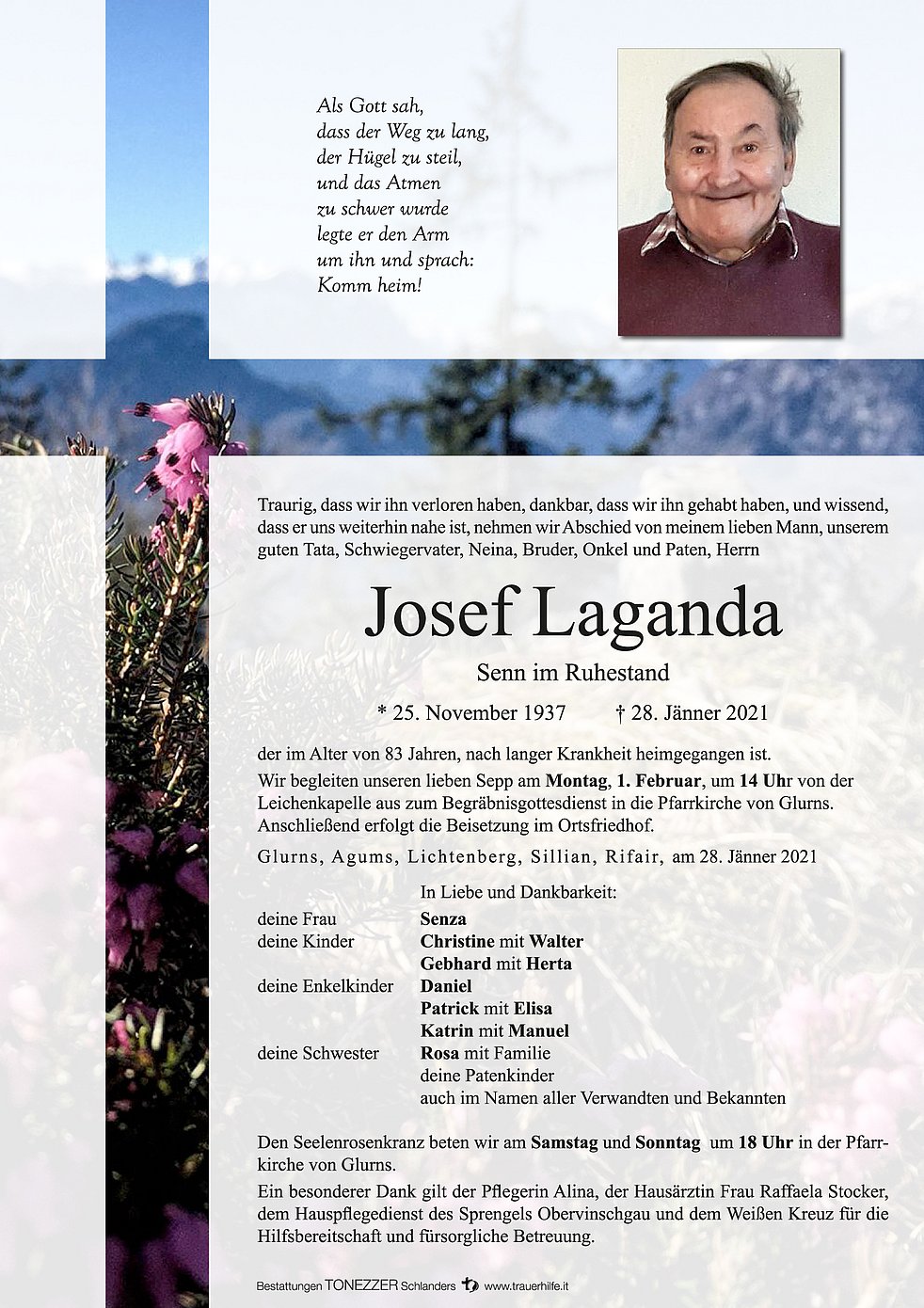 Wir begleiten unseren lieben Sepp am Montag, 1. Februar, um 14 Uhr von der Leichenkapelle aus zum Begräbnisgottesdienst in die Pfarrkirche von Glurns.