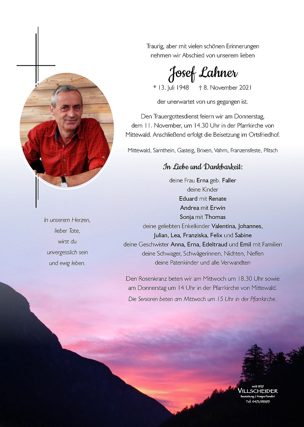 Begräbnisgottesdienst: 11.11. - 14:30 Uhr Mittewald