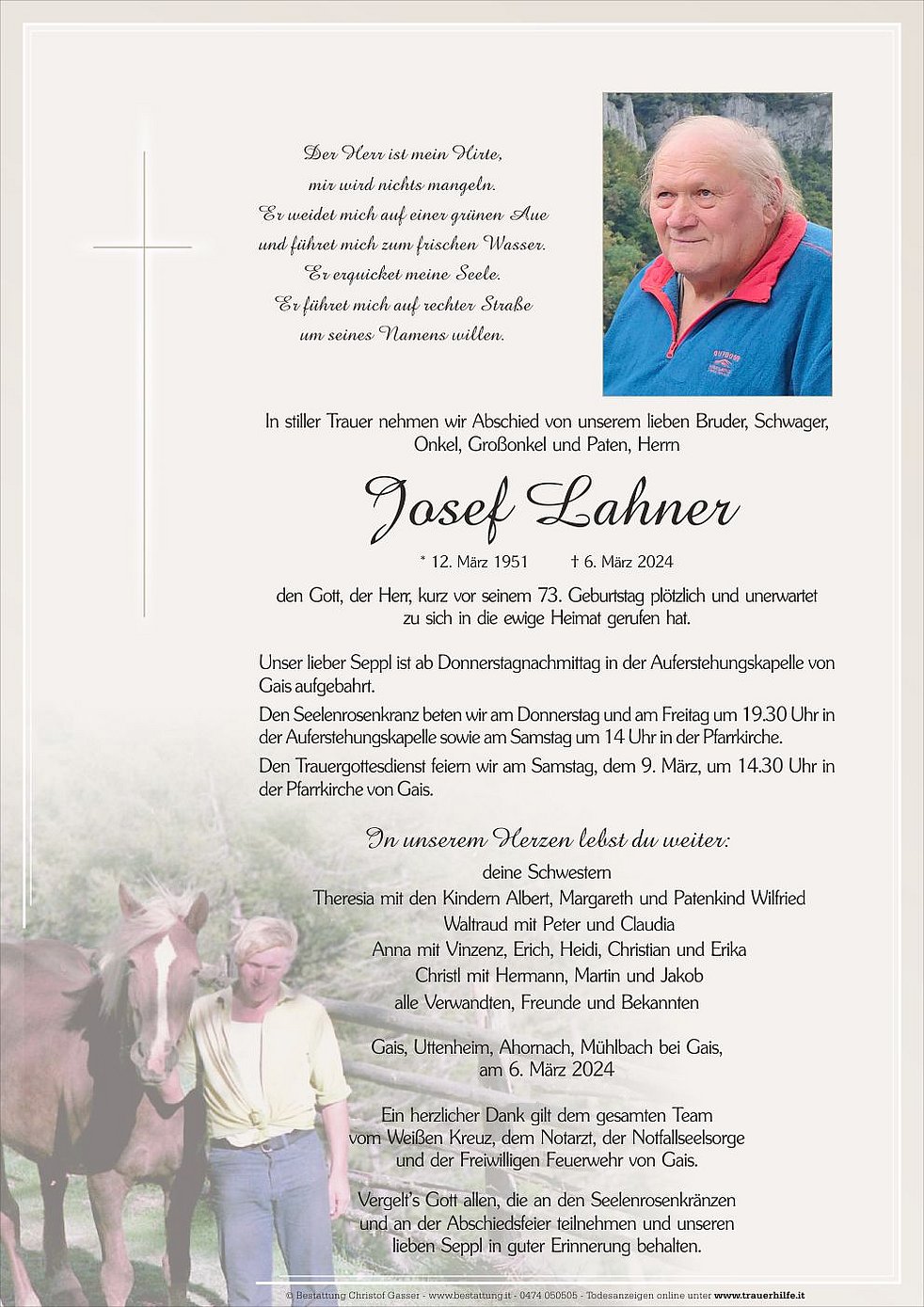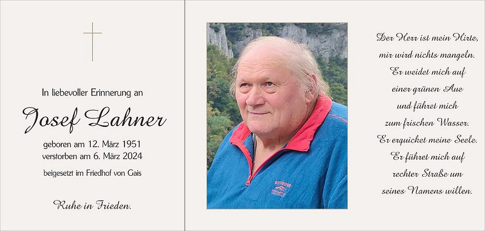 Den Trauergottesdienst feiern wir am Samstag, dem 9. März, um 14.30 Uhr in der Pfarrkirche von Gais.