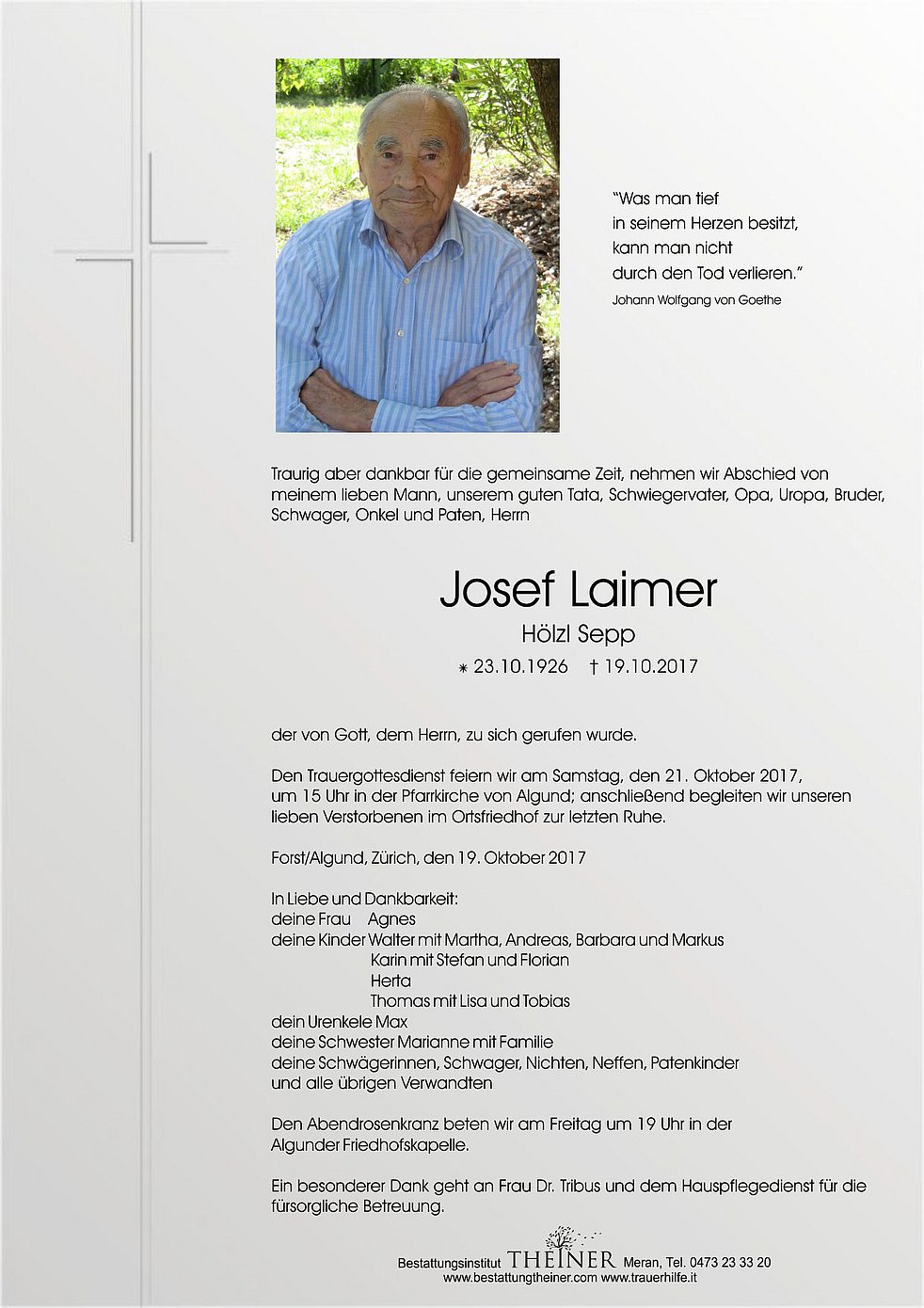 Den Trauergottesdienst feiern wir am Samstag, den 21. Oktober 2017, um 15 Uhr in der Pfarrkirche von Algund; anschließend begleiten wir unseren lieben Verstorbenen im Ortsfriedhof zur letzten Ruhe.