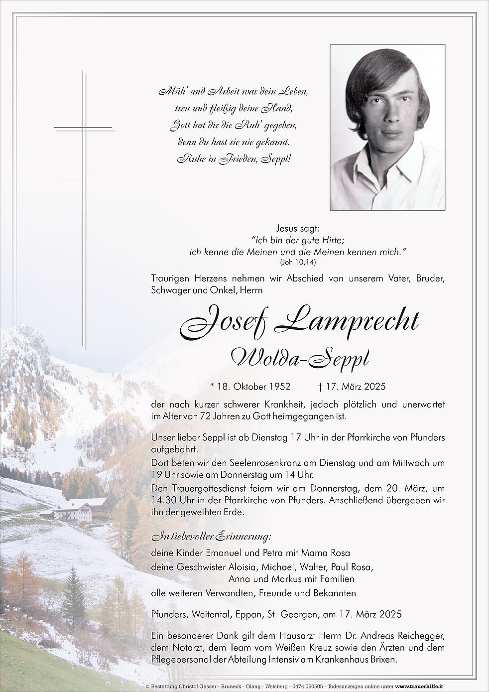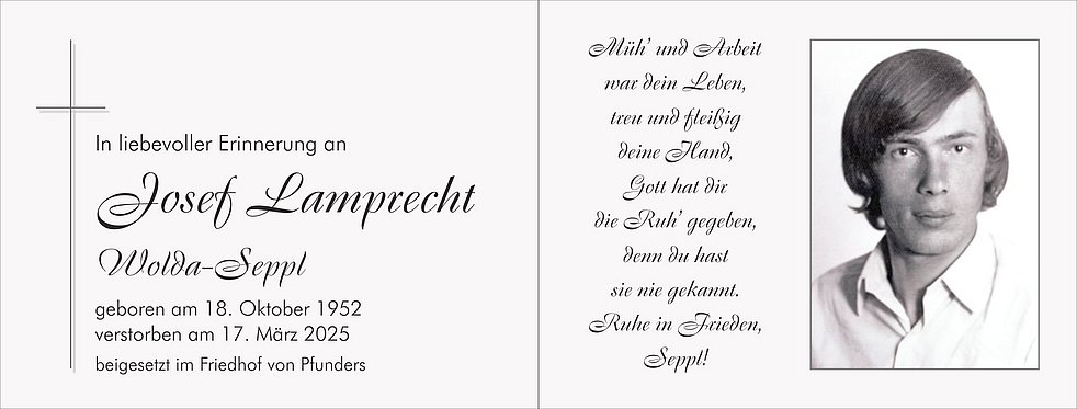Unser lieber Seppl ist ab Dienstag 17 Uhr in der Pfarrkirche von Pfunders aufgebahrt.