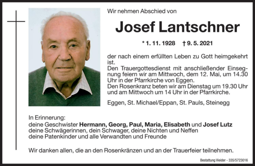 Den Trauergottesdienst mit anschließender Einsegnung feiern wir am Mittwoch, dem 12. Mai um 14.30 Uhr in der Pfarrkirche von Eggen .