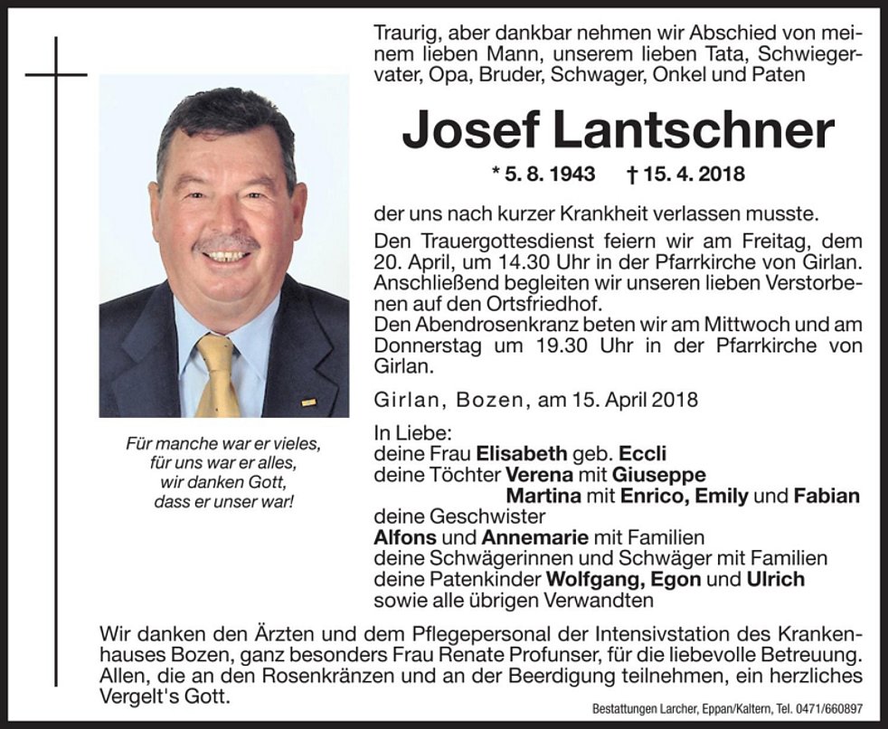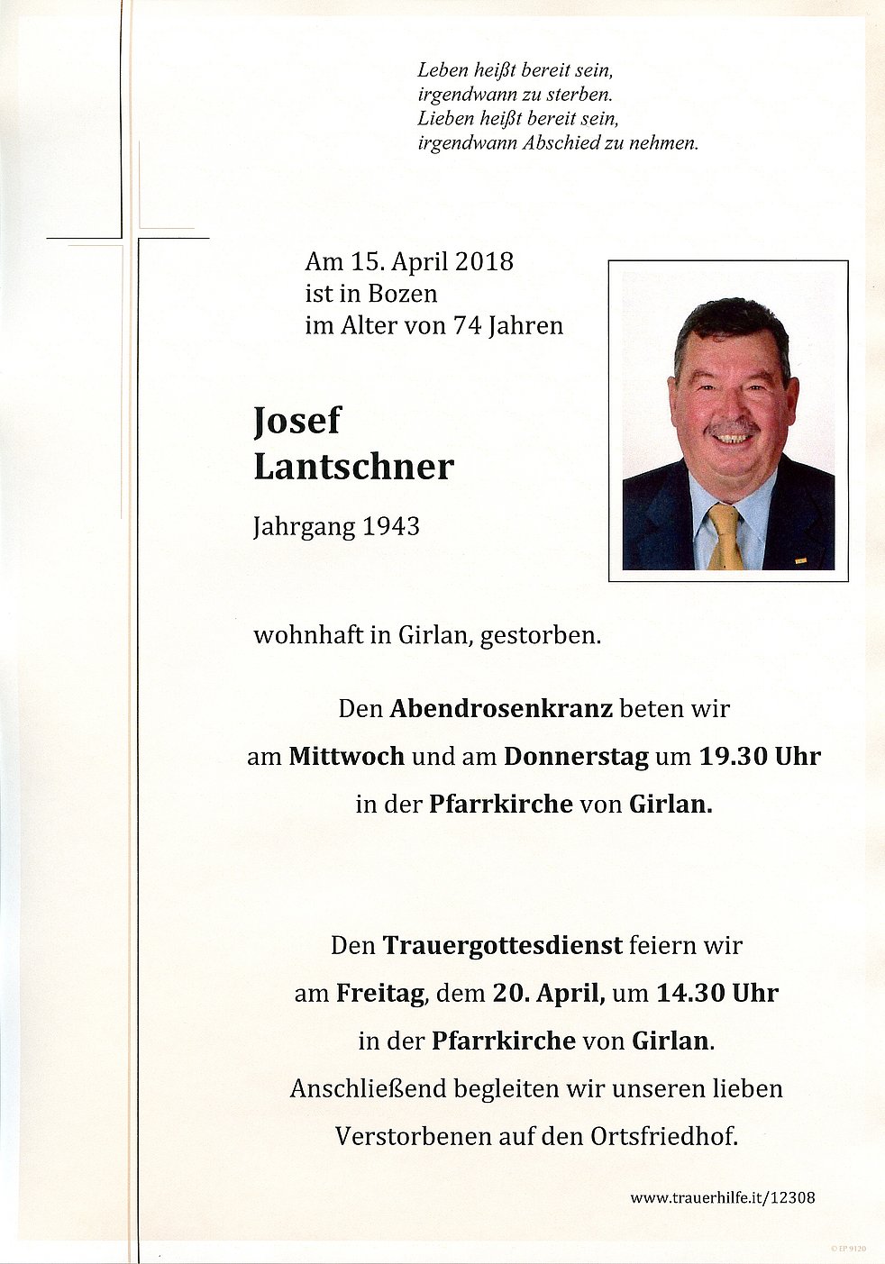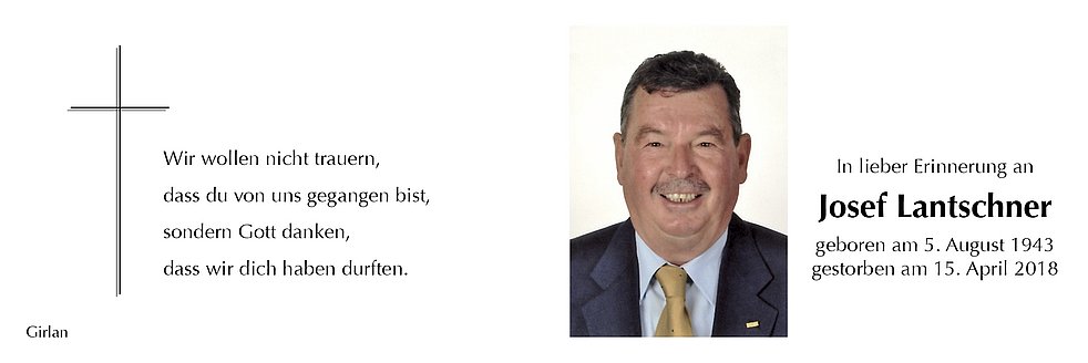 Den Trauergottesdienst feiern wir am Freitag dem 20. April um 14.30 Uhr in der Pfarrkirche von Girlan. Anschließend begleiten wir unseren lieben Verstorbenen auf den Ortsfriedhof.