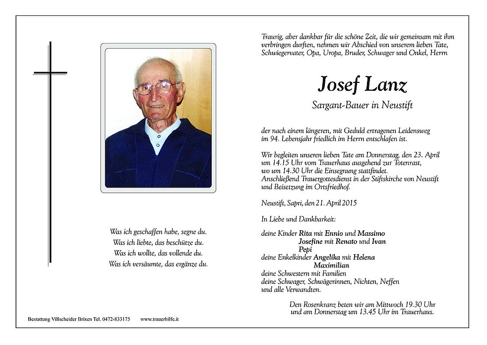 Traurig, aber dankbar für die schöne Zeit, die wir gemeinsam mit ihm verbringen durften, nehmen wir Abschied von unserem lieben Tate, Schwiegervater, Opa, Uropa, Bruder, Schwager und Onkel, Herrn