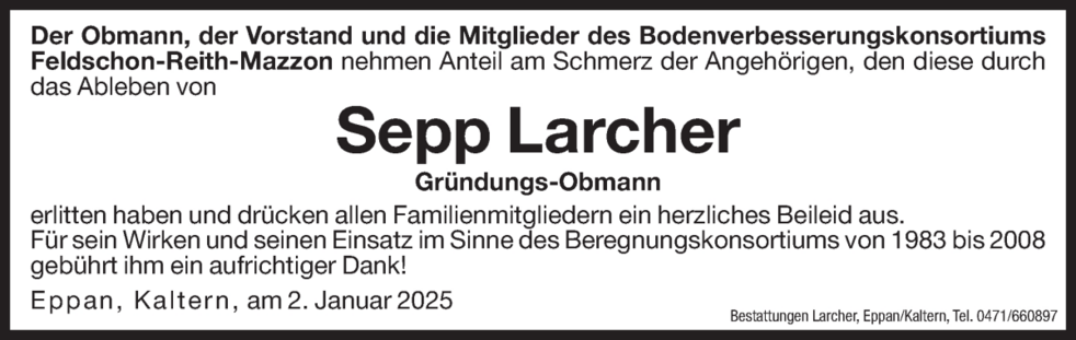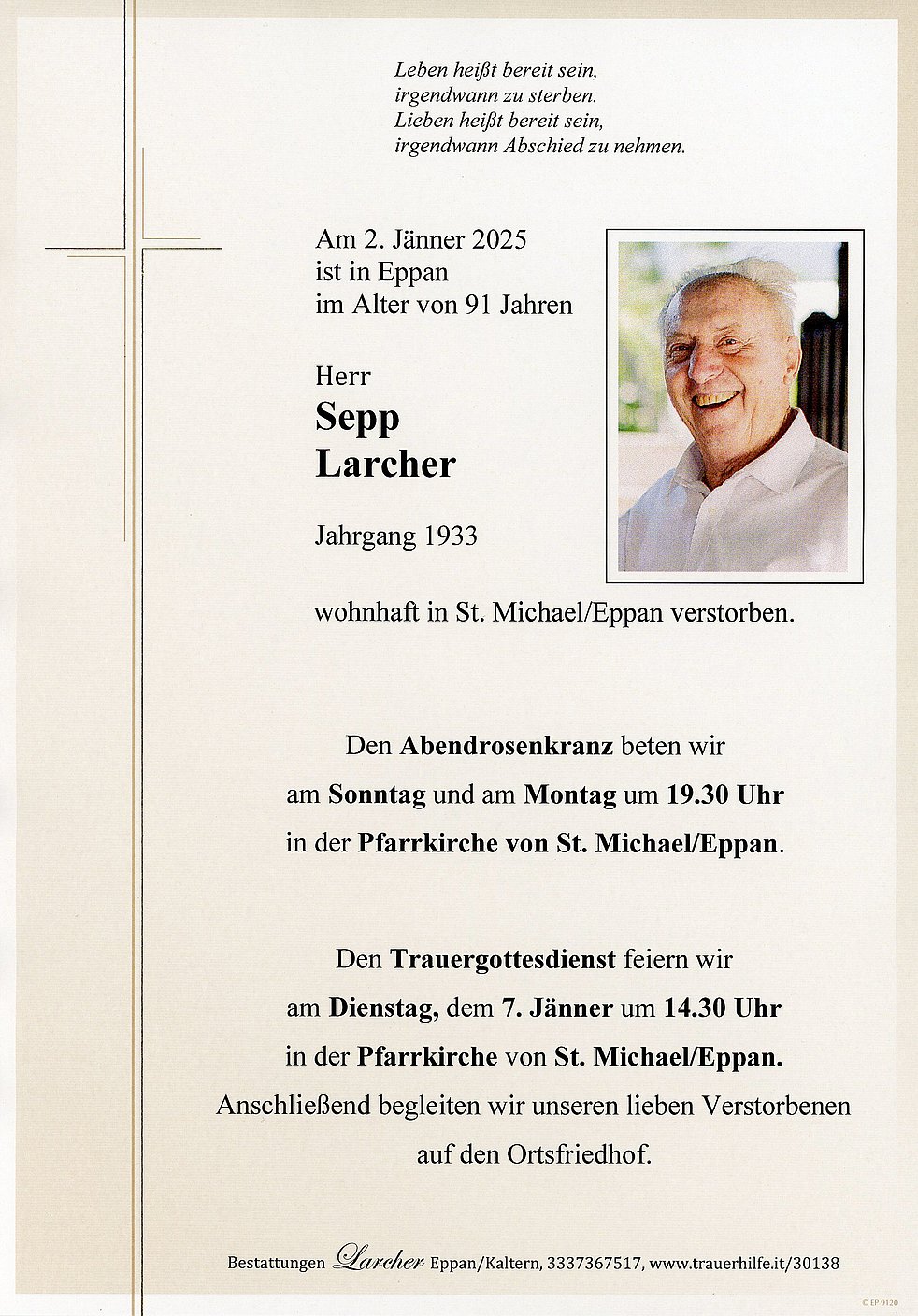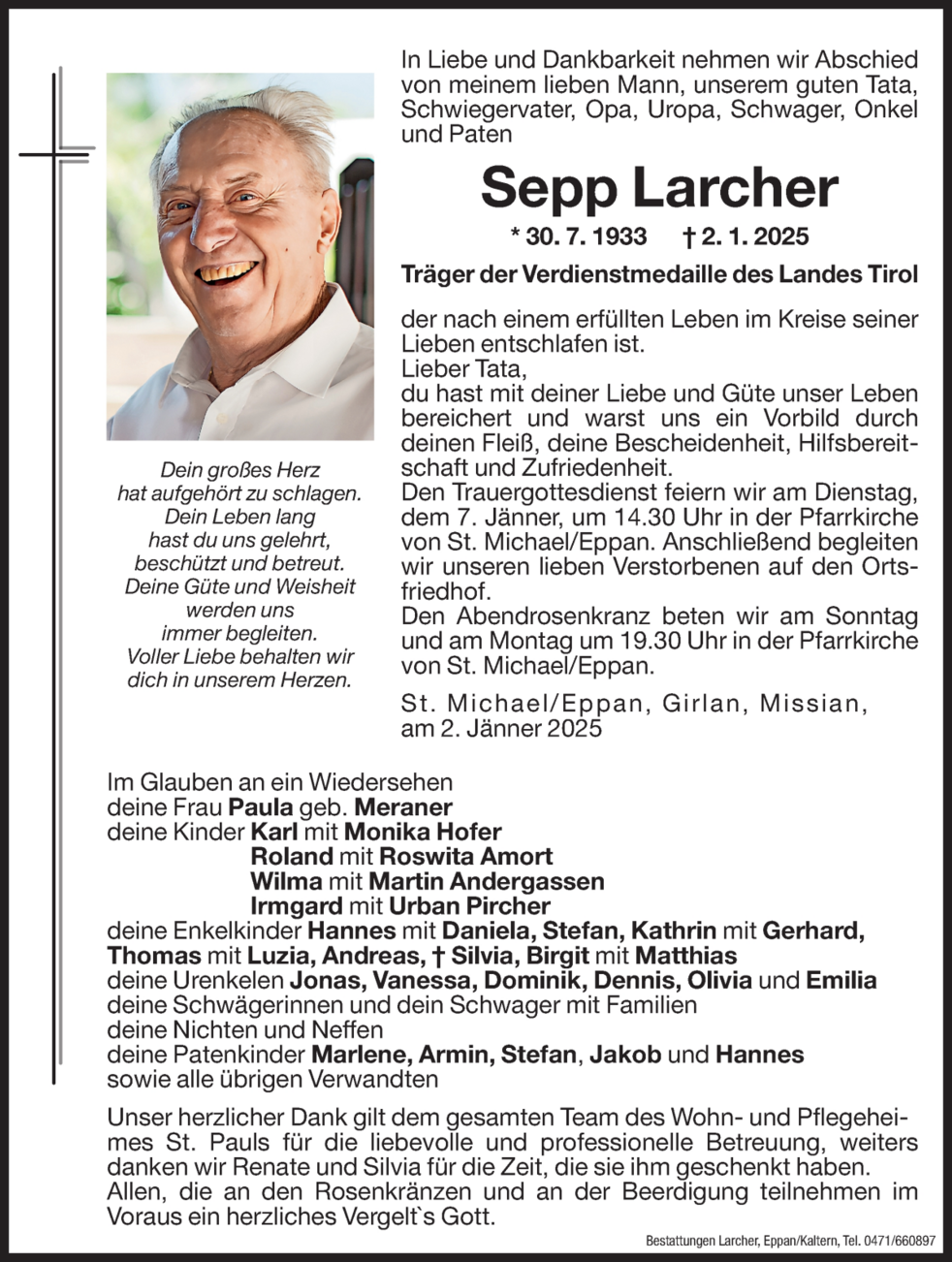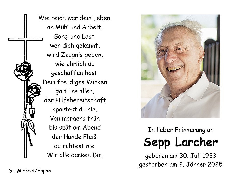 Den Trauergottesdienst feiern wir am Dienstag, dem 7. Jänner um 14.30 Uhr in der Pfarrkirche von St. Michael/Eppan. Anschließend begleiten wir unseren lieben Verstorbenen auf den Ortsfriedhof.