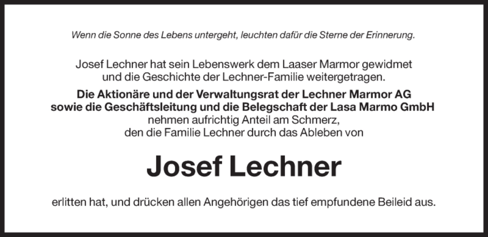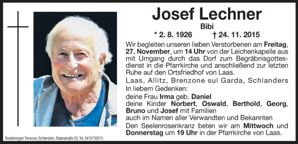 Wir begleiten unseren lieben Verstorbenen am Freitag, 27. November, um 14 Uhr von der Leichenkapelle aus mit Umgang durch das Dorf zum Begräbnisgottesdienst in die Pfarrkirche und anschließend zur letzten Ruhe auf den Ortsfriedhof von Laas.