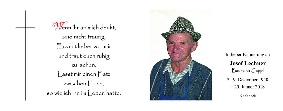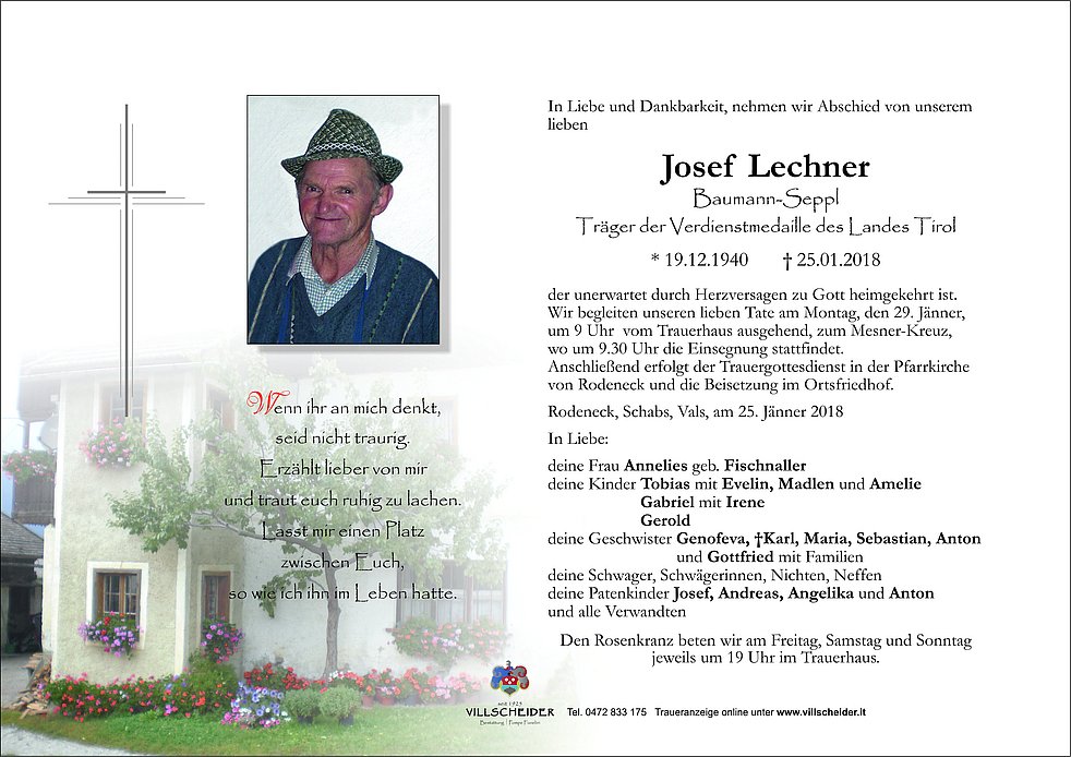 Wir begleiten unseren lieben Tate am Montag, den 29. Jänner, um 9 Uhr vom Trauerhaus ausgehend, zum Mesner-Kreuz,