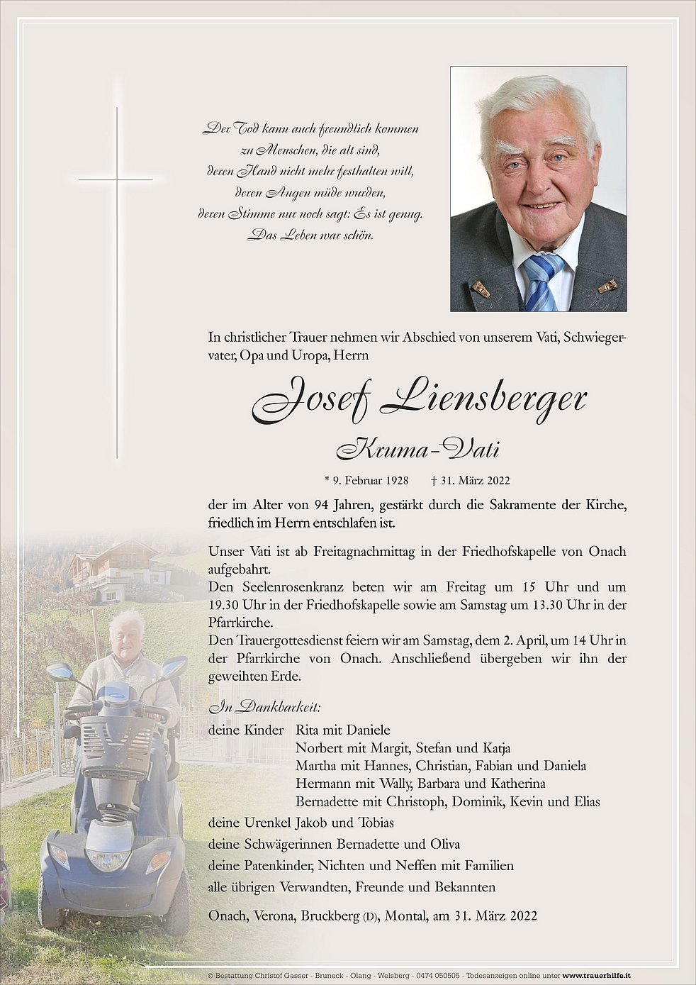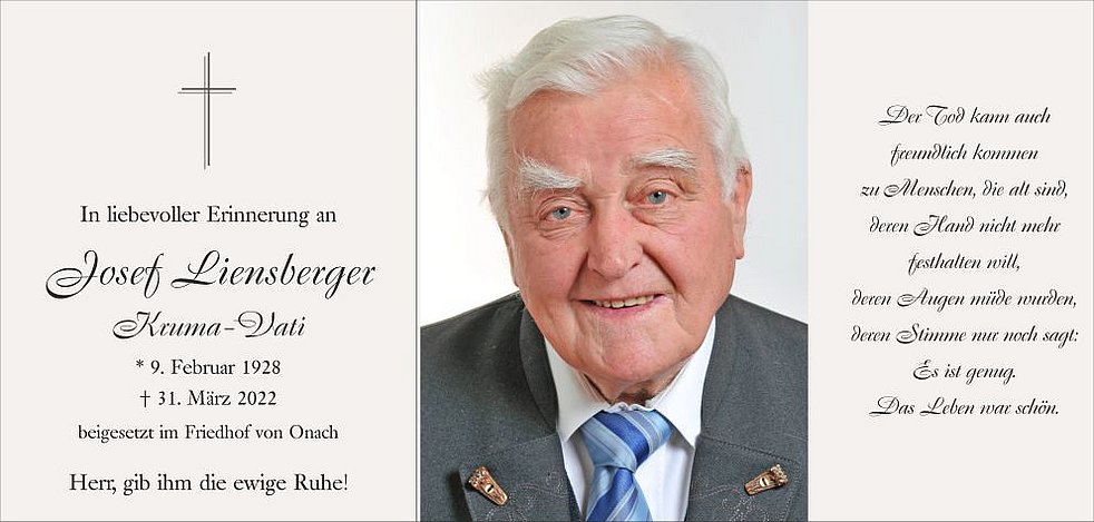 Den Trauergottesdienst feiern wir am Samstag, dem 2. April, um 14 Uhr in der Pfarrkirche von Onach. Anschließend übergeben wir ihn der geweihten Erde.