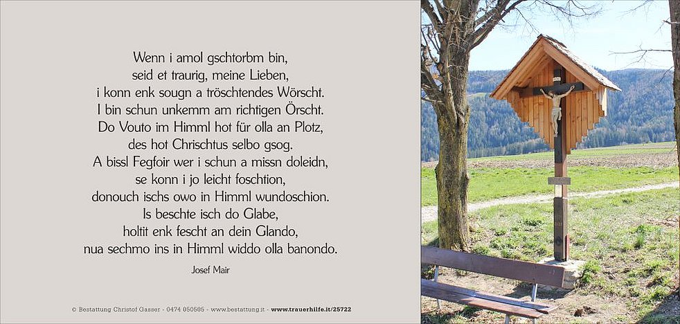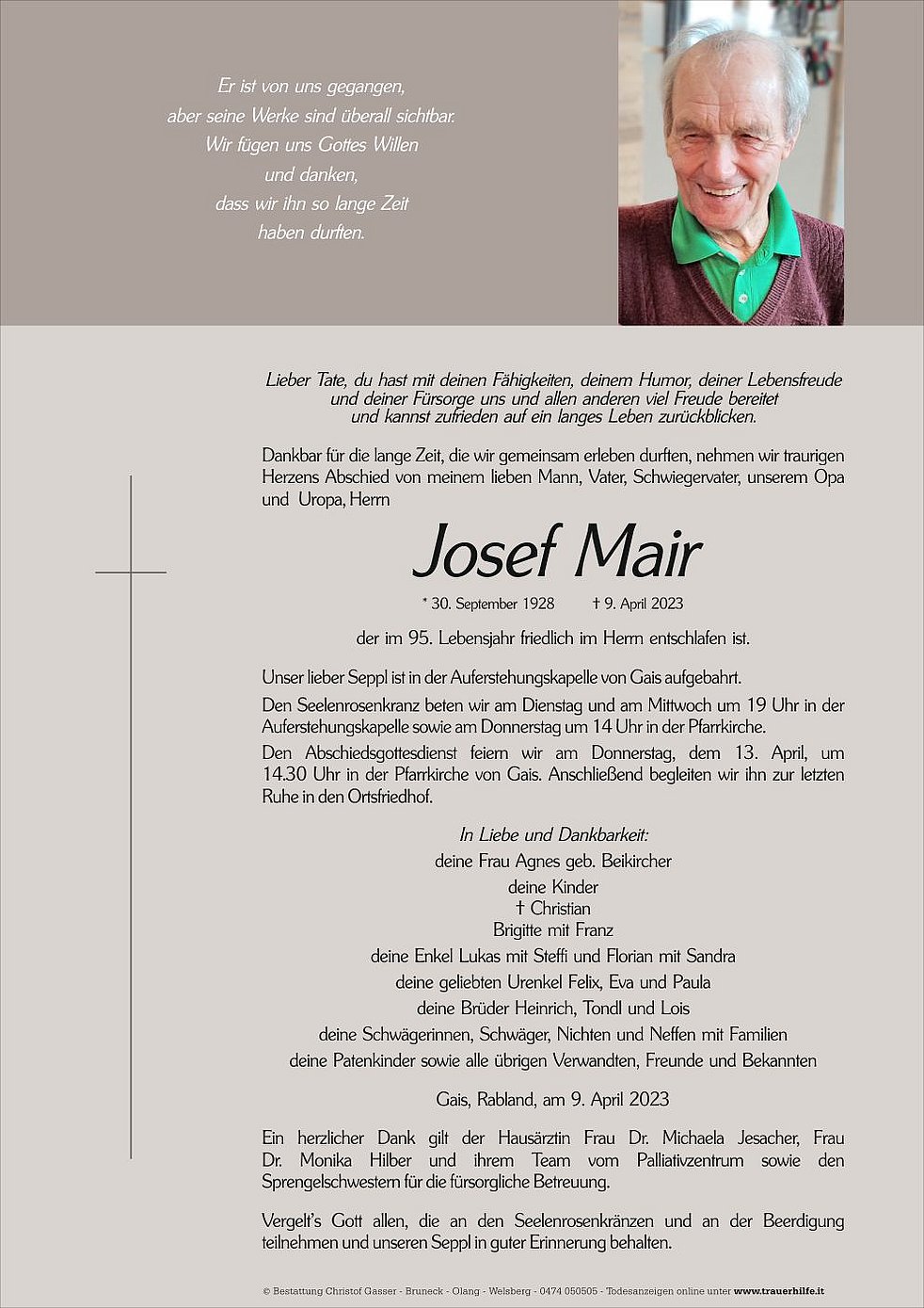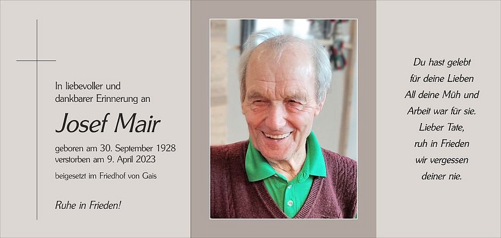 14.30 Uhr in der Pfarrkirche von Gais. Anschließend begleiten wir ihn zur letzten Ruhe in den Ortsfriedhof.