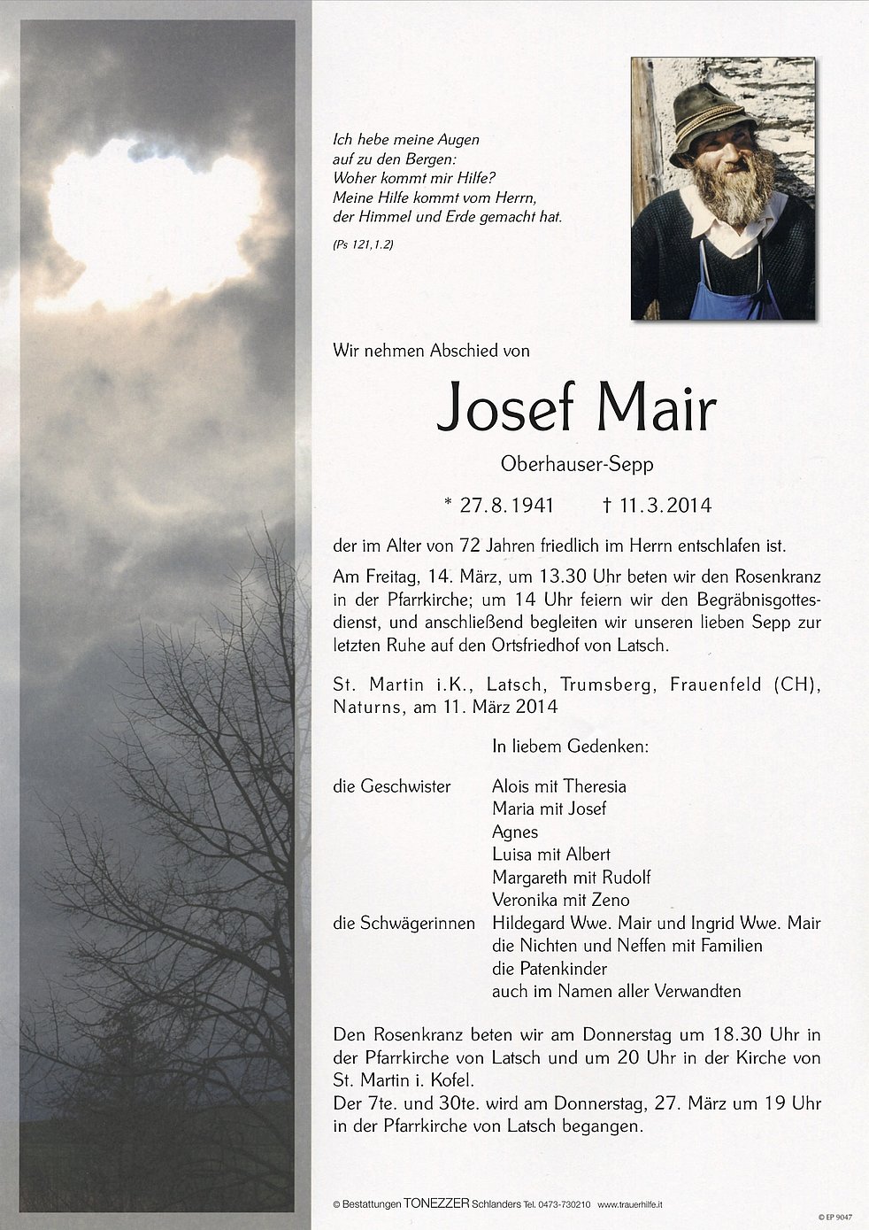 Am Freitag, 14. März, um 13.30 Uhr beten wir den Rosenkranz in der Pfarrkirche; um 14 Uhr feiern wir den Begräbnisgottesdienst, und anschließend begleiten wir unseren lieben Sepp zur letzten Ruhe auf den Ortsfriedhof von Latsch.