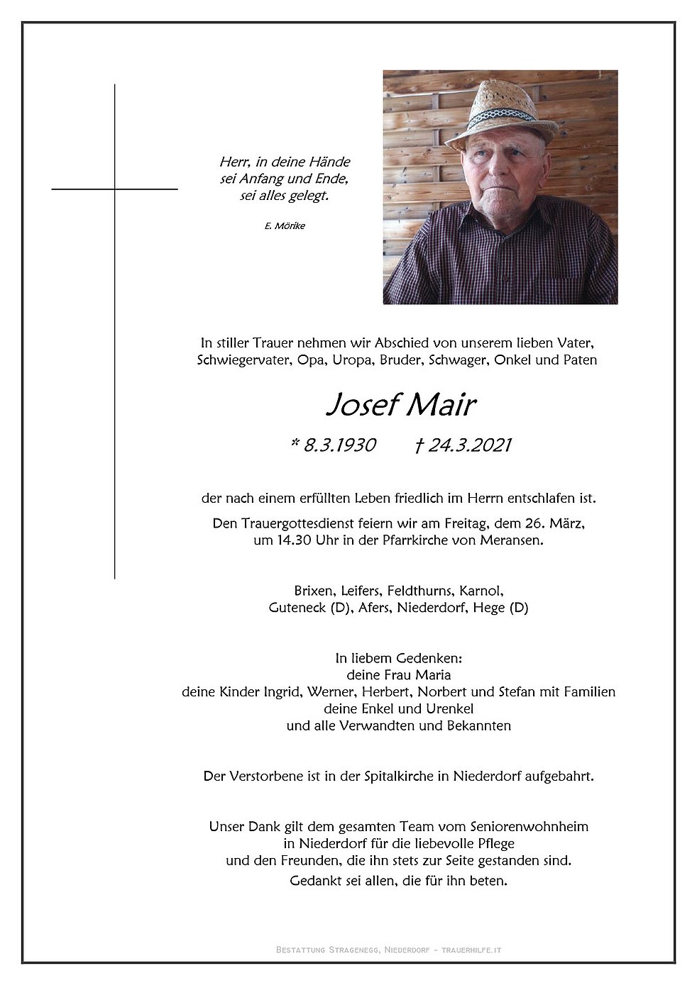 Den Trauergottesdienst feiern wir am Freitag, dem 26. März, um 14.30 Uhr in der Pfarrkirche von Meransen.