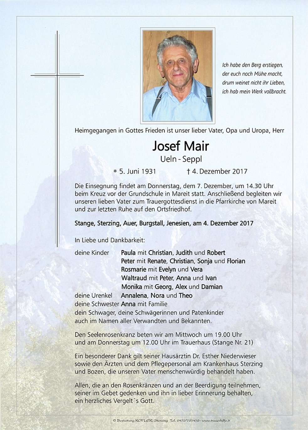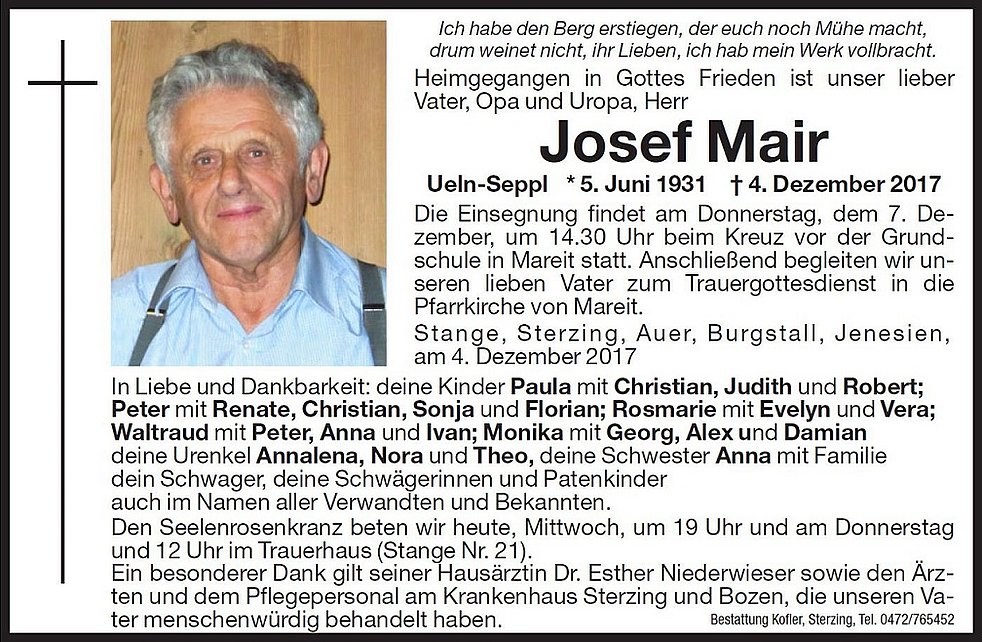 Ein besonderer Dank gilt seiner Hausärztin Dr. Esther Niederwieser sowie den Ärzten und dem Pflegepersonal am Krankenhaus Sterzing und Bozen, die unseren Vater menschenwürdig behandelt haben.