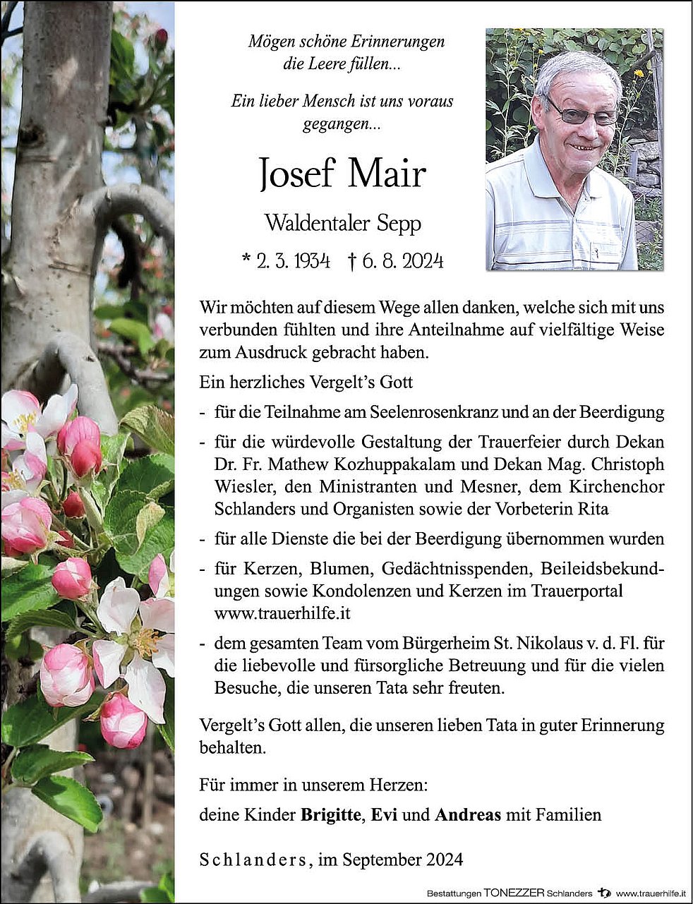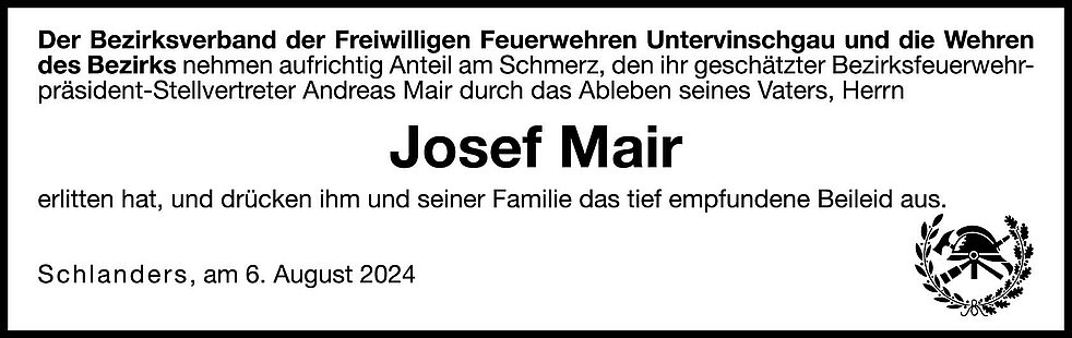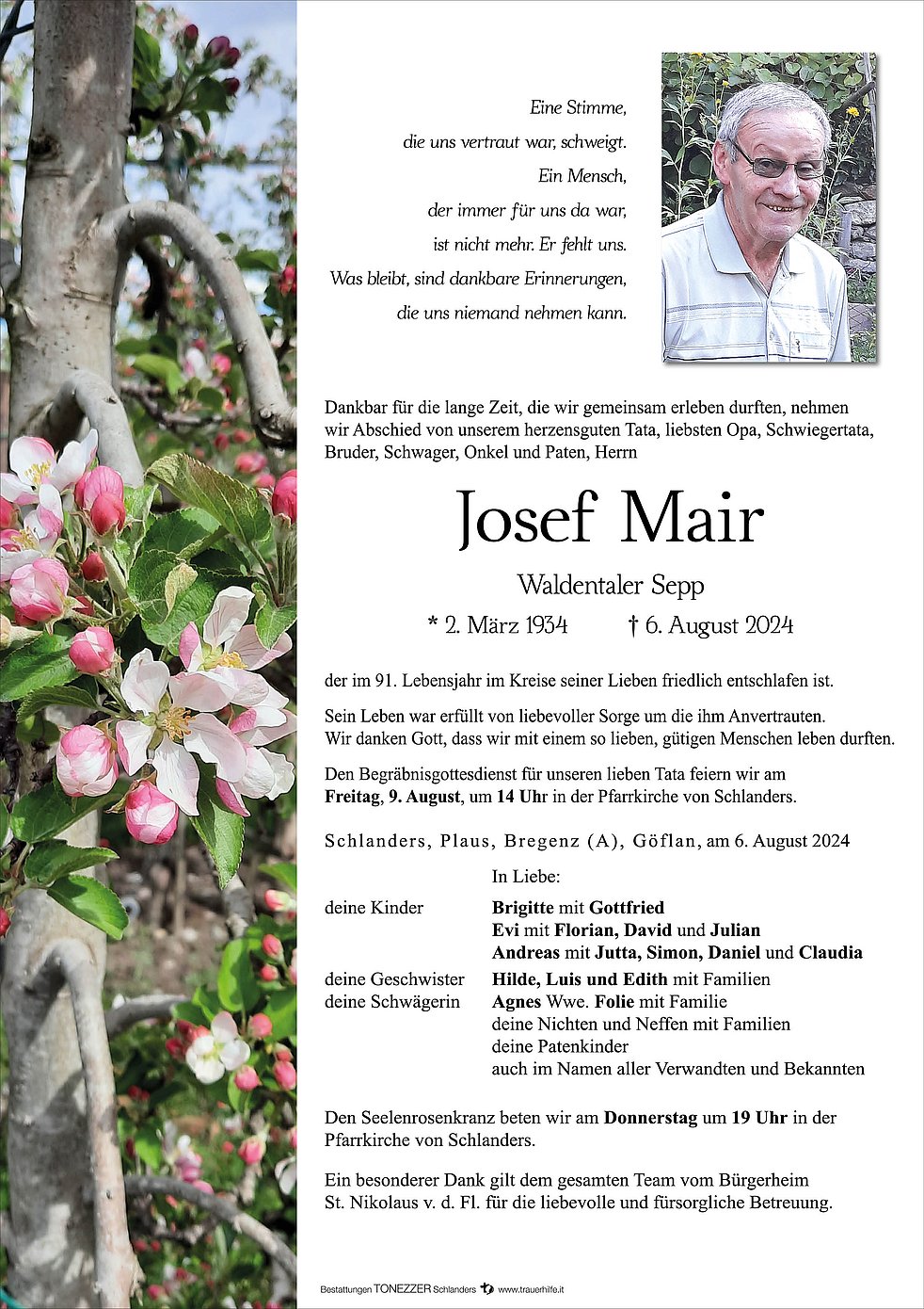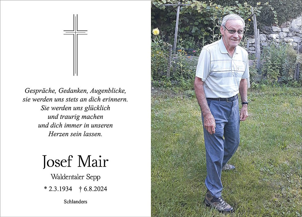 Den Begräbnisgottesdienst für unseren lieben Tata feiern wir am Freitag, 9. August, um 14 Uhr in der Pfarrkirche von Schlanders.