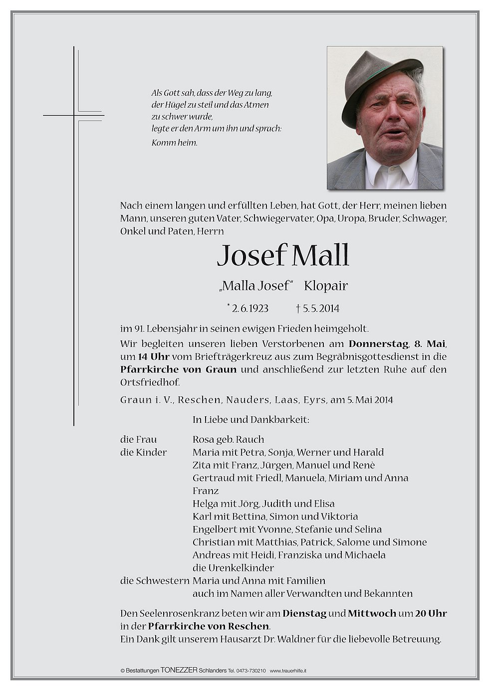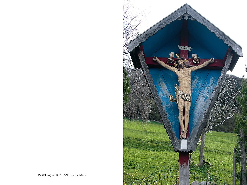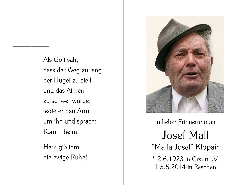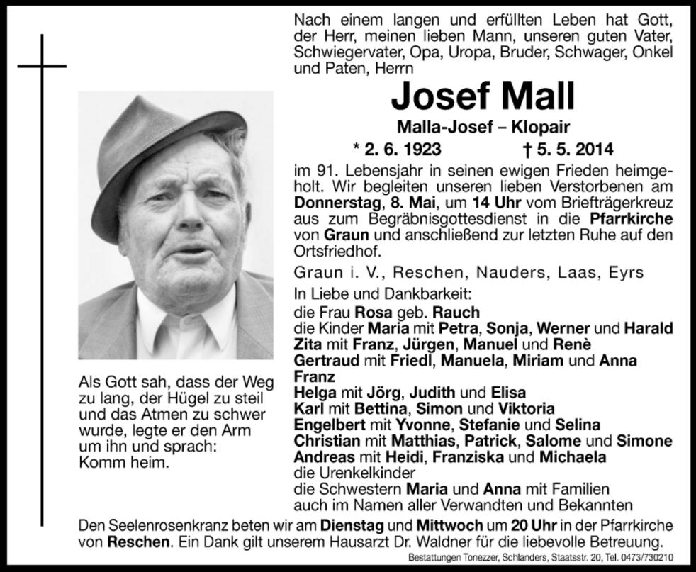 Wir begleiten unseren lieben Verstorbenen am Donnerstag, 8. Mai, um 14 Uhr vom Briefträgerkreuz aus zum Begräbnisgottesdienst in die Pfarrkirche von Graun und anschließend zur letzten Ruhe auf den Ortsfriedhof.