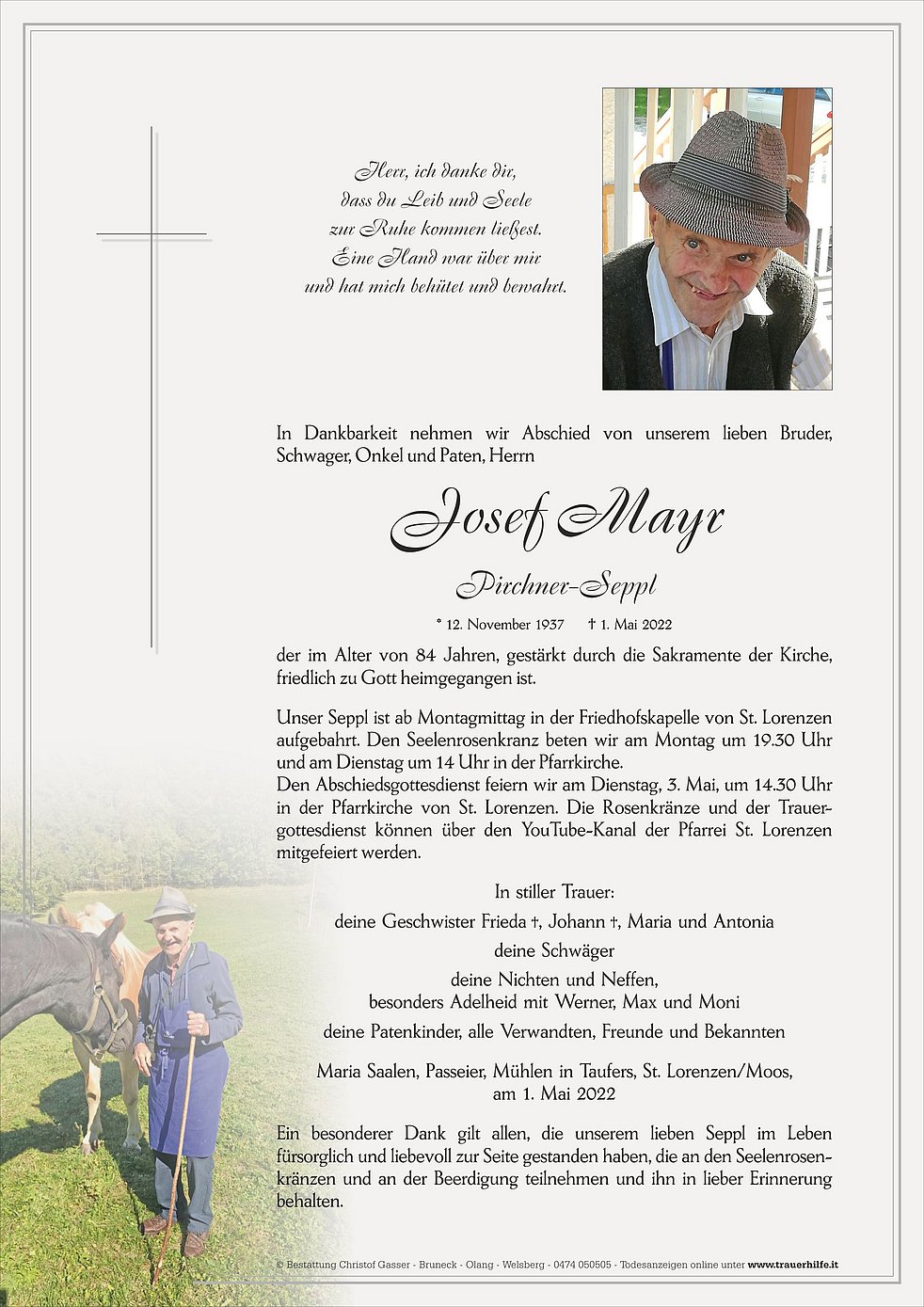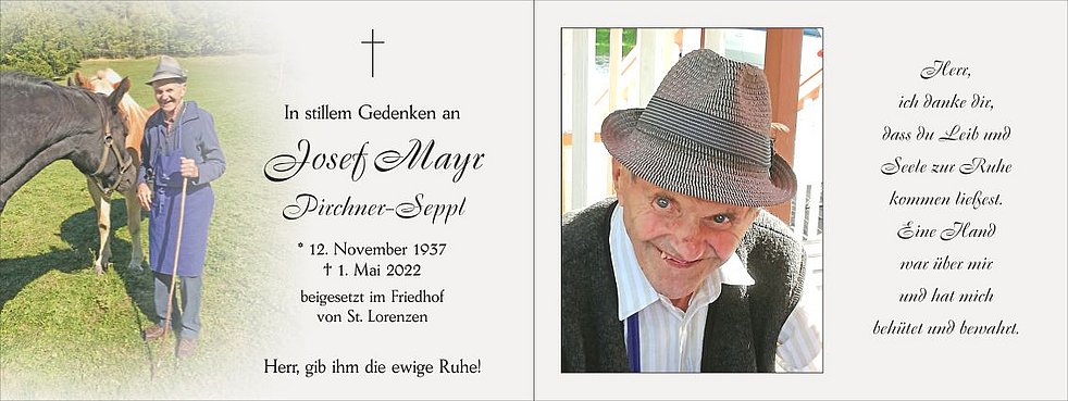 Unser Seppl ist ab Montagmittag in der Friedhofskapelle von St. Lorenzen aufgebahrt. Den Seelenrosenkranz beten wir am Montag um 19.30 Uhr und am Dienstag um 14 Uhr in der Pfarrkirche.
