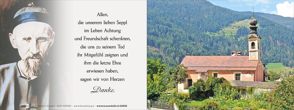 Ein besonderer Dank gilt allen, die unserem lieben Seppl im Leben fürsorglich und liebevoll zur Seite gestanden haben, die an den Seelenrosenkränzen und an der Beerdigung teilnehmen und ihn in lieber Erinnerung behalten.